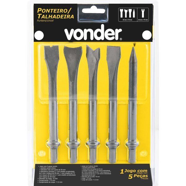 Conteúdo da embalagem 1 Jogo composto por 5 peças, sendo: 1 ponteiro, 1 talhadeira reta com ponta de 20 mm e 3 talhadeiras goivadas (1 com entalhe arredondado de 4 mm e largura de 20 mm, 1 com entalhe em "V" com largura de 20 mm e 1 com entalhe arredondado com largura de 26 mm) Aplicações e dicas de uso Indicado para o martelo rebarbador MR 190 VONDER
