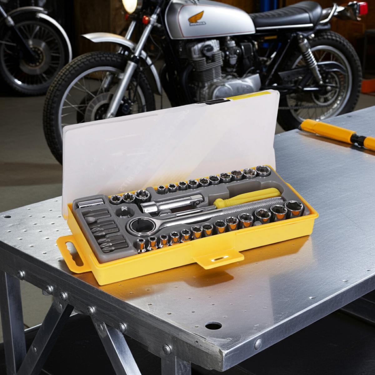 O conjunto inclui soquetes sextavados em milímetros e polegadas, bits Phillips, Fenda e Pozidriv, além de adaptadores, extensão e chave catraca reversível, permitindo que você tenha todas as soluções necessárias em um único kit, seja para trabalhos domésticos ou profissionais.