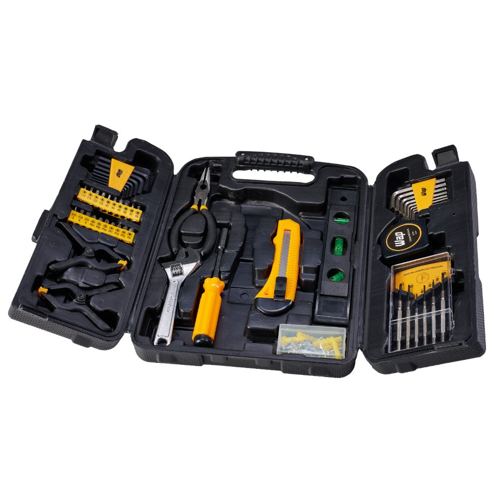 Para tornar o trabalho mais funcional, vem com 1 estilete 18 mm, 1 trena métrica de 3,5m x 12mm com freio manual, 1 alicate bico meia cana 6,5" (160mm) e 1 nível 9" (230mm) de 3 bolhas. E para trazer mais conforto durante o uso, o 1 martelo unha 350g possui cabo metálico e pega emborrachada.