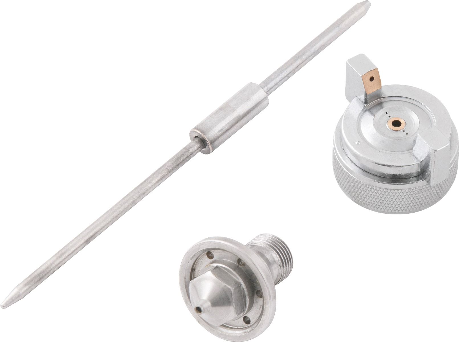 1 Agulha de 1,4 mm, 1 guia da agulha, 1 núcleo da mola, ( já montados) 1 capa de ar, 1 porca do bico, 1 anel da capa de ar, 1 porca da capa de ar (já montados) e 1 bico de 1,4 mm.