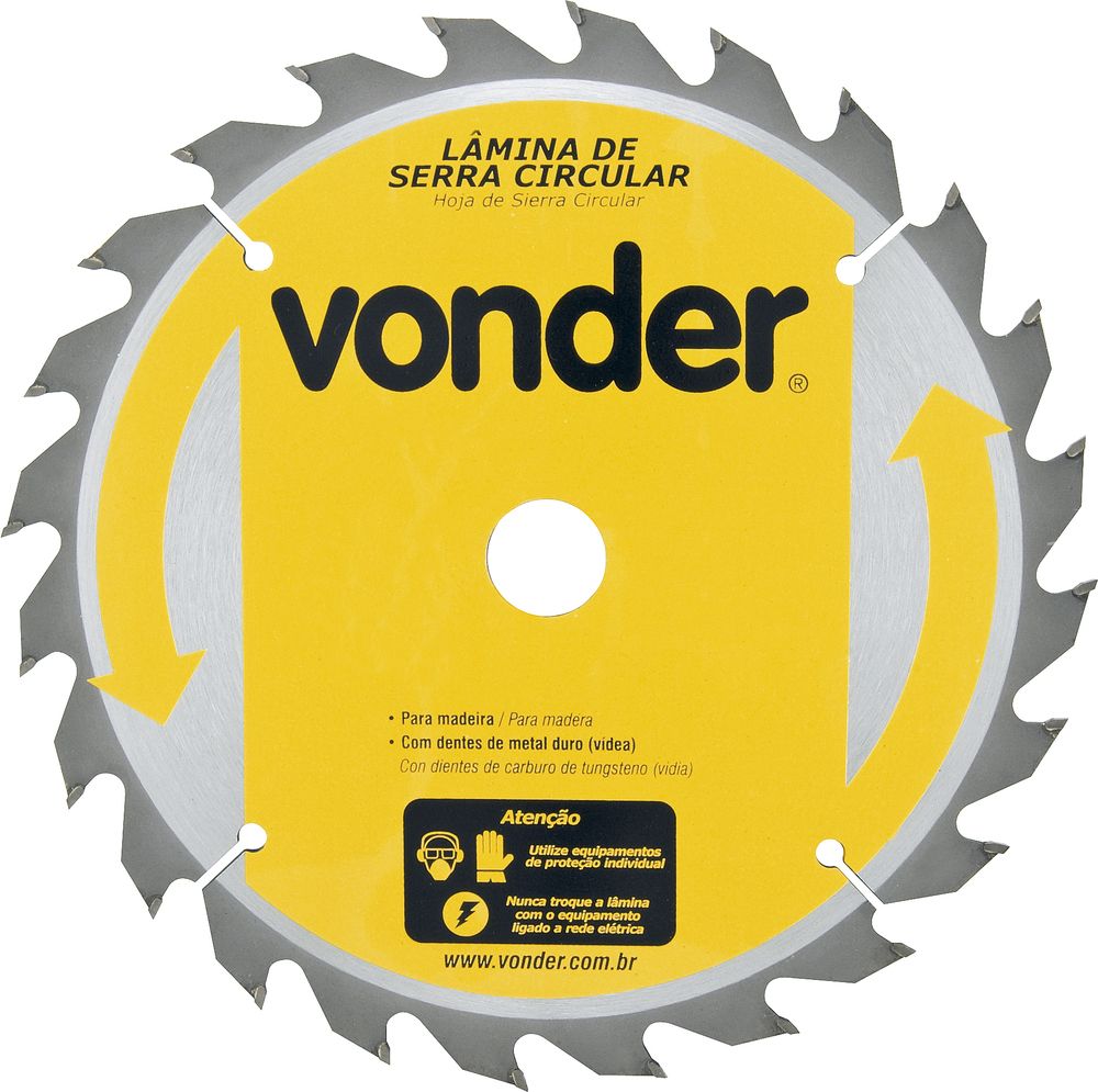Conteúdo da embalagem 1 Lâmina de serra circular Aplicações e dicas de uso Indicada para cortar madeiras e derivados. Nunca exceder a rotação máxima (rpm) - risco de acidente e/ou queima da lâmina. Não cortar madeiras impregnadas com massa ou cimento. Destaques e diferenciais Corpo em aço carbono com dentes de metal duro/vídea que proporcionam maior vida útil