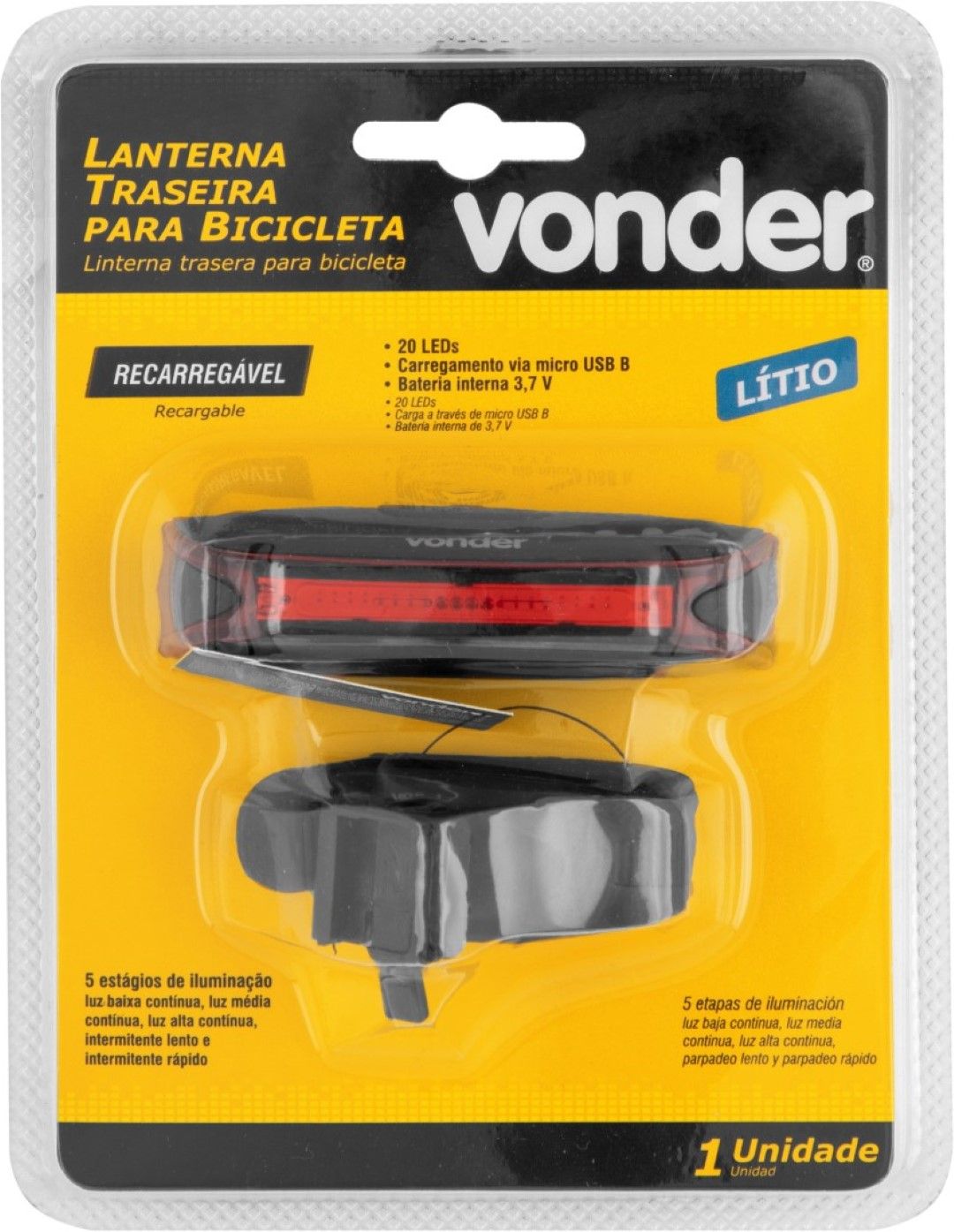 Indicada para iluminação em geral. Adaptável em bicicletas. Dimensões: 80,0 mm x 24,0 mm x 51,0 mm. Fluxo luminoso: baixo: 7,7 lúmens/médio: 15 lúmens/alto: 29 lúmens. Pressione o botão para alternar entre os níveis de luminosidade. Mantenha o botão pressionado para alternar entre os modos de funcionamento: contínuo e intermitente.