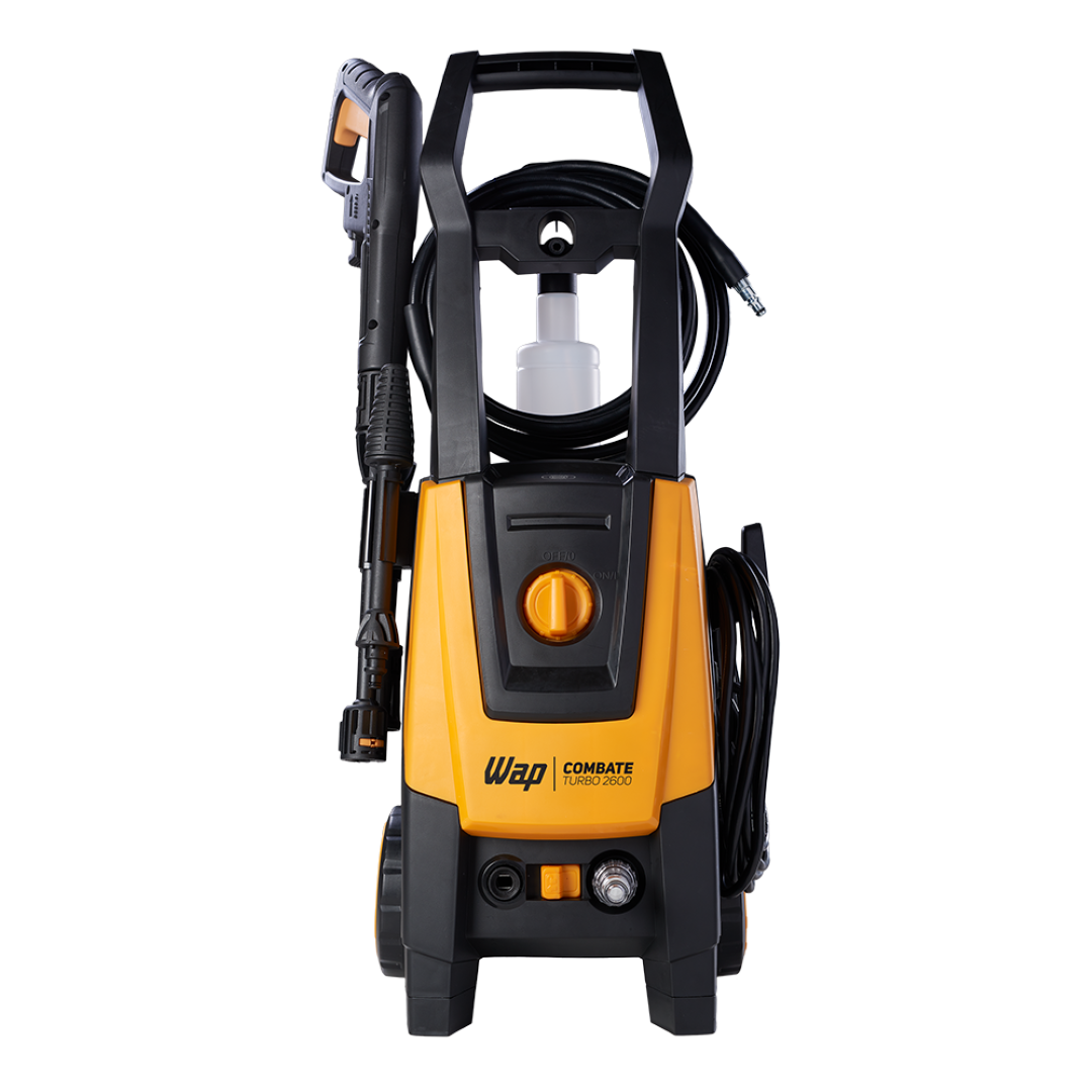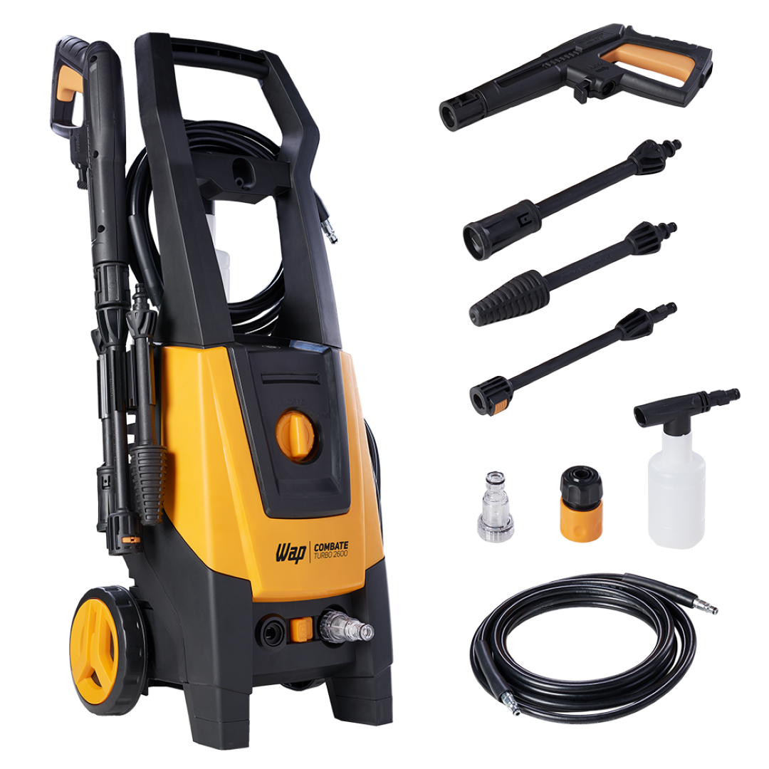 Equipada com alça e rodas que facilitam o transporte, a WAP Combate Turbo 2600 conta com cabo elétrico de 5 metros, mangueira de alta pressão de 5 metros, trava de segurança da pistola, bico regulável (leque ou concentrado), aplicador de detergente e o sistema stop total, que corta o fluxo de água e a energia do motor ao soltar o gatilho, poupando energia e aumentando a vida útil do motor.