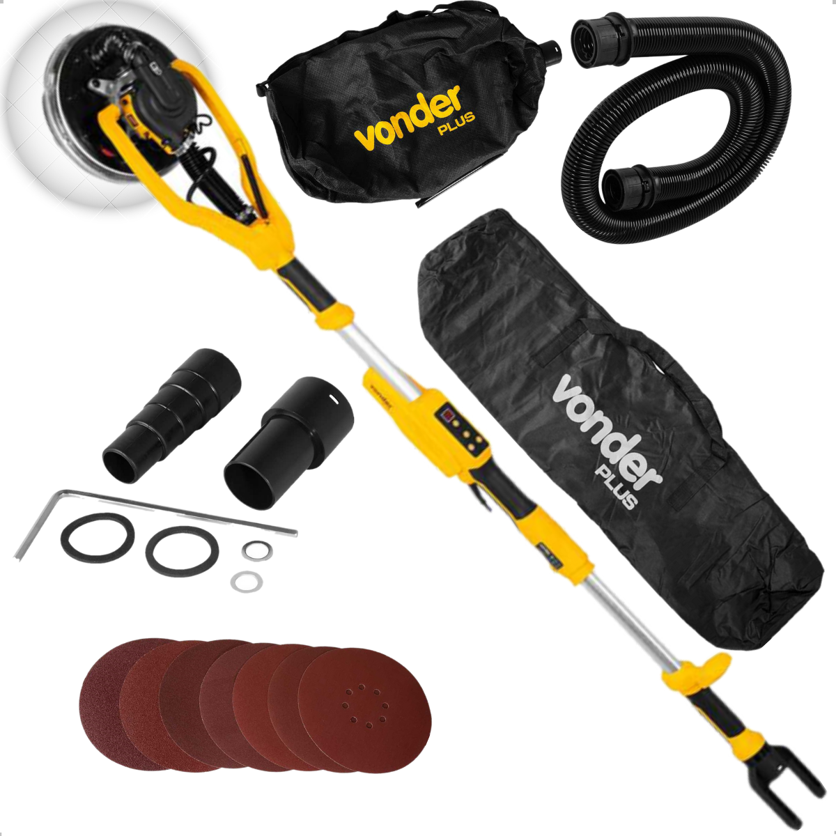 A Lixadeira de Parede Vonder Plus LPV 950B já vem com tudo o que você precisa para começar a trabalhar: são 7 lixas com diferentes grãos (60, 80, 100, 120, 150, 180 e 240), um tubo extensor, saco coletor de pó, adaptadores para aspirador de pó e uma bolsa para armazenamento e transporte. Acessórios completos para garantir que você tenha uma experiência de trabalho tranquila e sem interrupções.