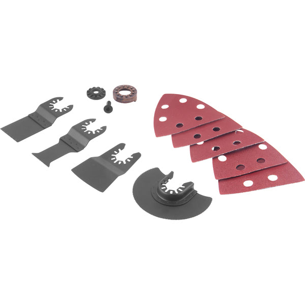 1 Lixadeira multifunção, acompanha: 1 lâmina para madeira, 1 lâmina para metal, 1 lâmina circular para madeira, 1 lâmina raspadora, 1 base para lixa 80 mm x 80 mm x 80 mm integrada com tubo adaptador para aspirador de pó e 5 peças de lixas (grão 60, 80, 120, 180 e 240)
