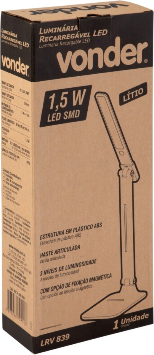 Prática e portátil, possui estrutura em plástico ABS, garantindo maior resistência. Conta com bateria recarregável de Íons de Lítio e haste articulada, removível e magnética, facilitando o direcionamento do foco de luz e aumentando as possibilidades de fixação. Além disso, possui comando touch com 3 níveis de luminosidade e lâmpadas de LED que proporcionam economia de energia e maior durabilidade. Conta ainda com porta-celular.