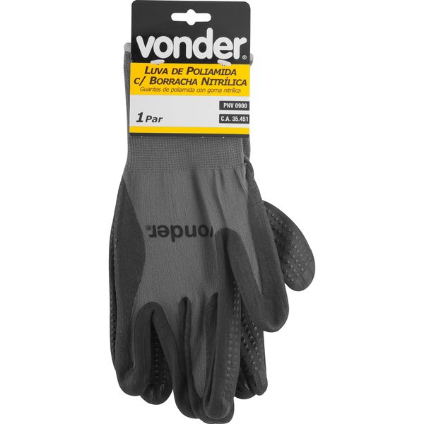 Conteúdo da embalagem 1 Par de luvas Aplicações e dicas de uso Indicada para proteção das mãos no manuseio de peças escorregadias, atividades de carga e descarga de materiais, em manutenções industriais, montadoras e autopeças e trabalhos que exijam aderência com excelente tato Destaques e diferenciais Possui pigmentos antiderrapantes de nitrilo na palma e face palmar dos dedos, proporcionando excelente aderência, além de punho tricotado em elastano com acabamento overloque