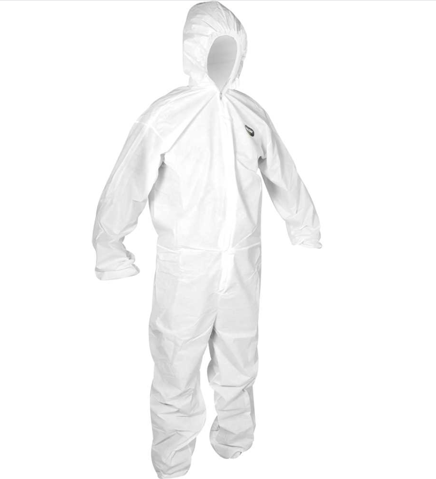 Macacão de segurança confeccionado em tecido de polipropileno laminado com filme de polietileno respirável. Conta com capuz, zíper na parte frontal e elásticos nos punhos, cintura, tornozelos e capuz.