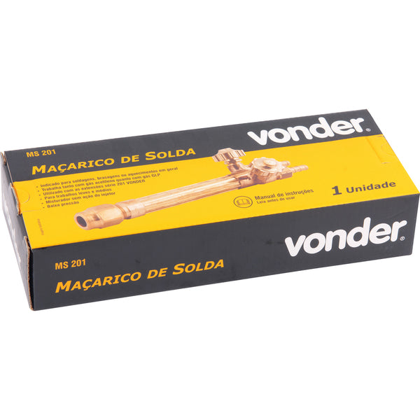 Conteúdo da embalagem 1 Maçarico de solda. Acompanha: 1 conjunto de porca e niple para conexão em mangueiras. Aplicações e dicas de uso Indicado para soldagens, brasagens ou aquecimentos e cortes em geral. Trabalha tanto com gás acetileno quanto com gás GLP. Utilizado com as extensões série 201 Vonder. Indicado para trabalhos leves e médios. Destaques e diferenciais Fabricado em latão de alta resistência. Atende as exigências das normas EN 5172 / NR18 / CGA E1.