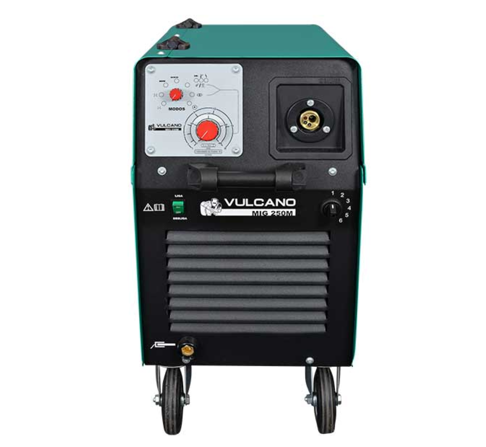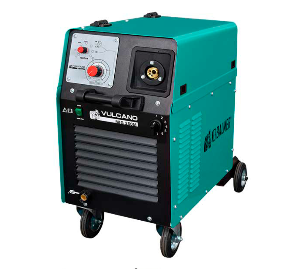 A fonte de soldagem MIG/MAG, modelo Vulcano MIG 250M proporciona uma excelente estabilidade do arco elétrico em todas as faixas de corrente de soldagem, com regulagem por comutador de múltiplas faixas que permite o ajuste preciso dos parâmetros, possui tracionador de 2 roletes com controle linear exato de velocidade com sistema de freio eletrônico do motor e compartimento do rolo de arame interno a fonte. Completa, conta com todos os recursos para o ótimo conforto operacional e produtivo, como rodízios de borracha, ventilação forçada, suporte de gás rebaixado e vários recursos técnicos, fazendo do equipamento BALMER perfeito para os mais exigentes profissionais. A máquina é de uso exclusivo para soldagem a arco MIG/MAG, não permitida a utilização para outras aplicações. A Vulcano MIG 250M é recomendada para a soldagem dos seguintes materiais: – Aço de baixa liga em soldagem MIG e MAG – Aço de alta liga em soldagem MIG – Alumínio e as respectivas ligas em soldagem MIG – Cobre e as respectivas ligas em soldagem MAG Garantia de 1 Ano