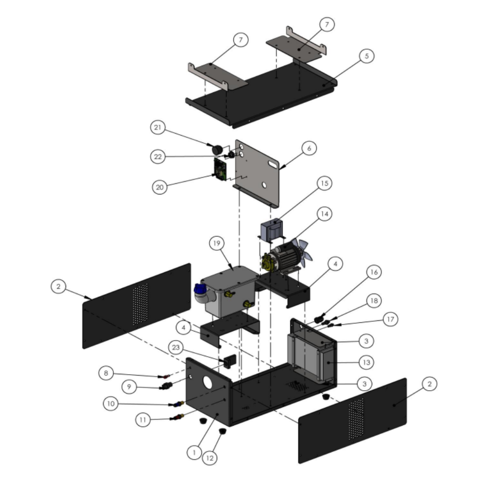A unidade de refrigeração é projetada para refrigeração de tochas MIG/MAG e TIG. Esta unidade tem a função de refrigerar as partes quentes da tocha durante a soldagem. Sendo composta de uma bomba elétrica de água, um trocador de calor, reservatório plástico, lâmpada e aviso sonoro, com indicador de "Falha de Refrigeração” integrado no painel, liquido refrigerante (água desmineralizada) e pressostato para proteção.