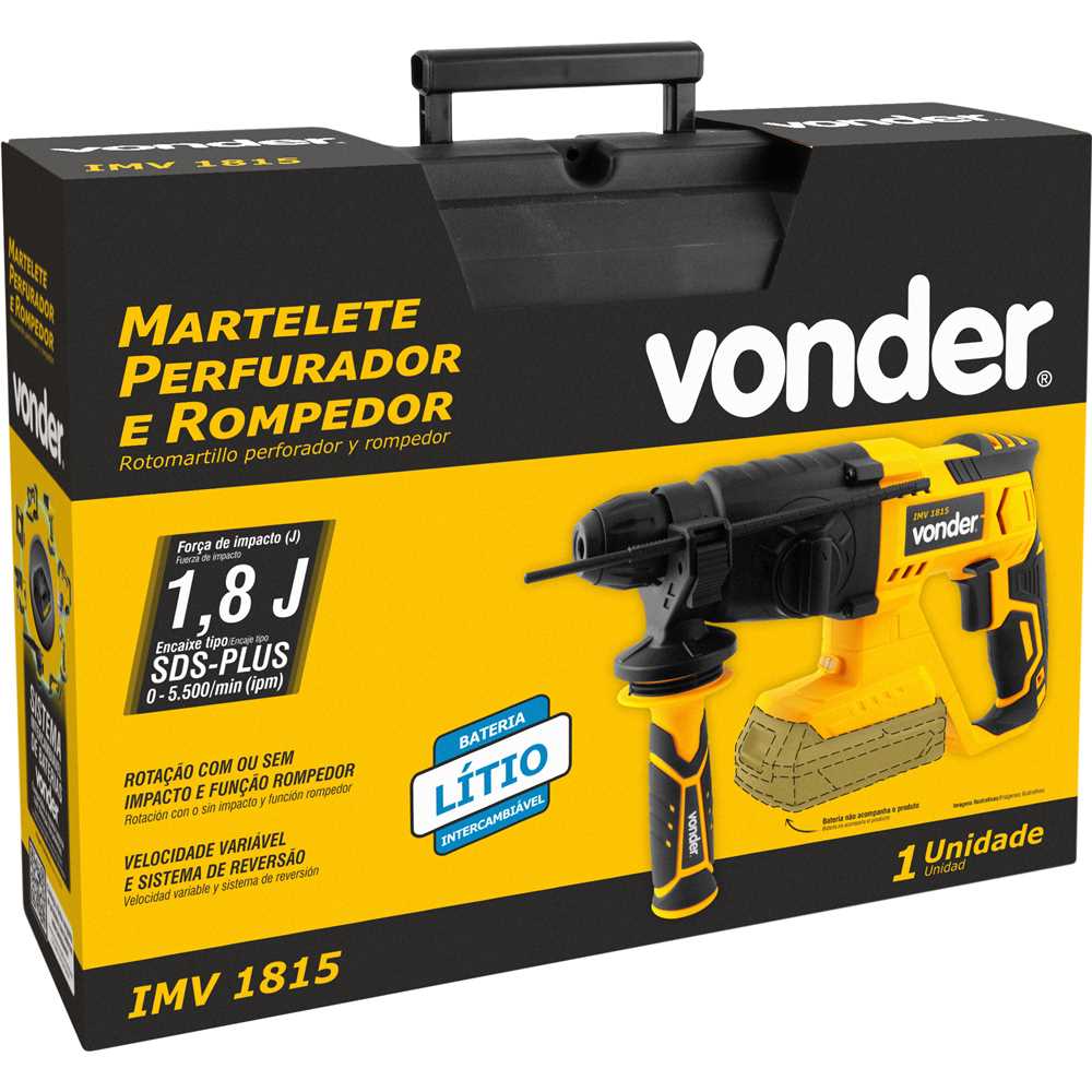 Este equipamento utiliza um modelo de bateria que pode ser intercambiável (não acompanha), ou seja, uma bateria que é compatível com outros modelos de ferramentas a bateria VONDER. Por isso, em sua próxima compra de ferramenta a bateria VONDER, procure um modelo que comece com a referência ?I?, ou que esteja identificado com o selo ?Bateria Intercambiável VONDER?. Desta forma, você garante modelos mais econômicos, sem a necessidade de aquisição de novas baterias e carregadores para uso em seu equipamento. Possui rotação com ou sem impacto e função rompedor, adequando-se a diferentes necessidades de uso. Seu sistema de encaixe tipo SDS PLUS facilita a troca rápida do acessório. Conta também com cabo com revestimento emborrachado e punho auxiliar com sistema de ajuste rápido do limitador de profundidade, conferindo praticidade e conforto ao operador.