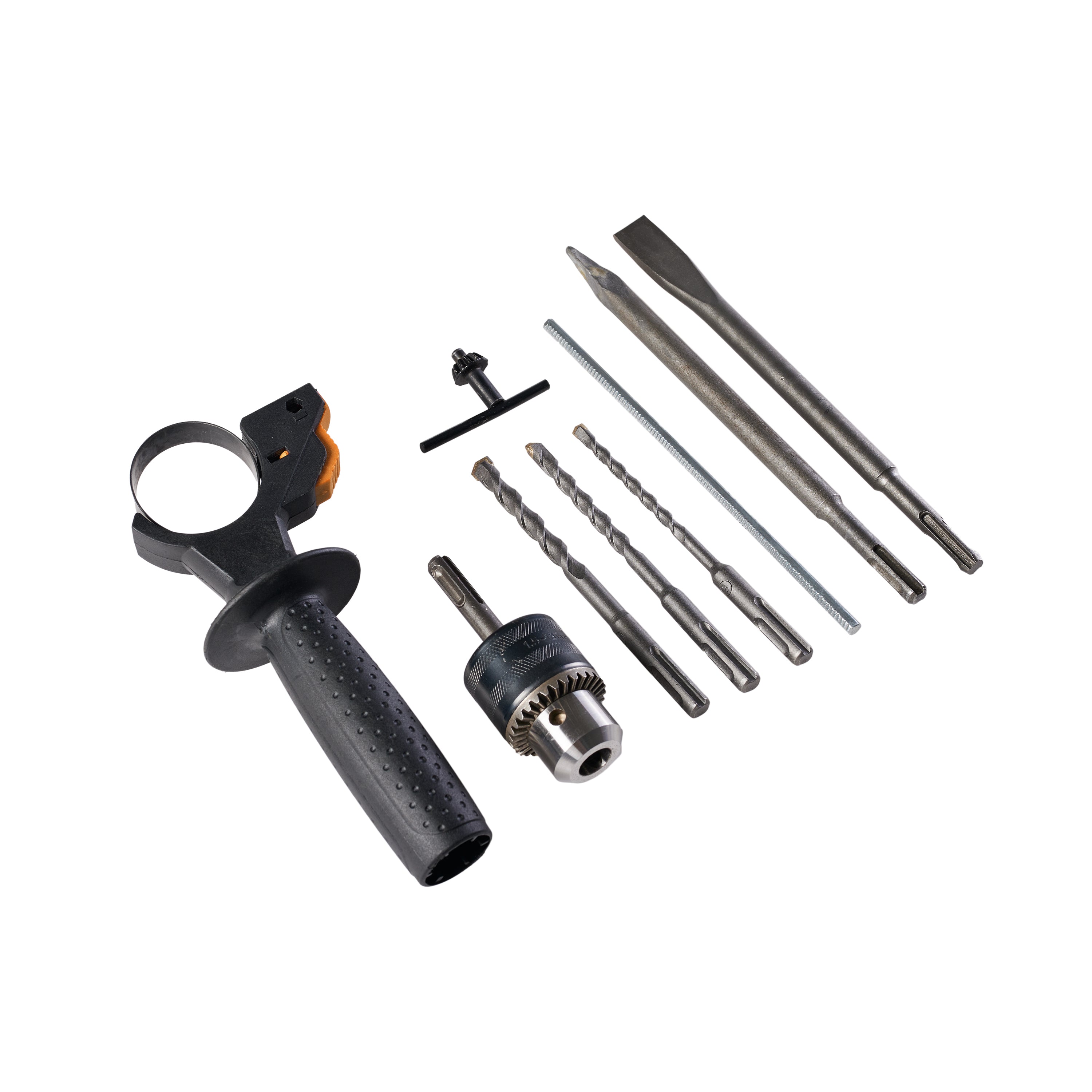 Possui motor com 900 W de potência, 100% rolamentada com até 5500 número de impactos. É uma ferramenta que pode executar tarefas pesadas, possuindo 35 Nm de Torque, o que auxilia na perfuração materiais duros. Também acompanha 1 chave de aperto para o mandril, 3 brocas para concreto Ø 6, 8, 10 mm, 1 ponteira hexagonal, 1 talhadeira, e mandril com adaptador, todos inclusos com uma maleta para o trabalho esteja sempre organizado.