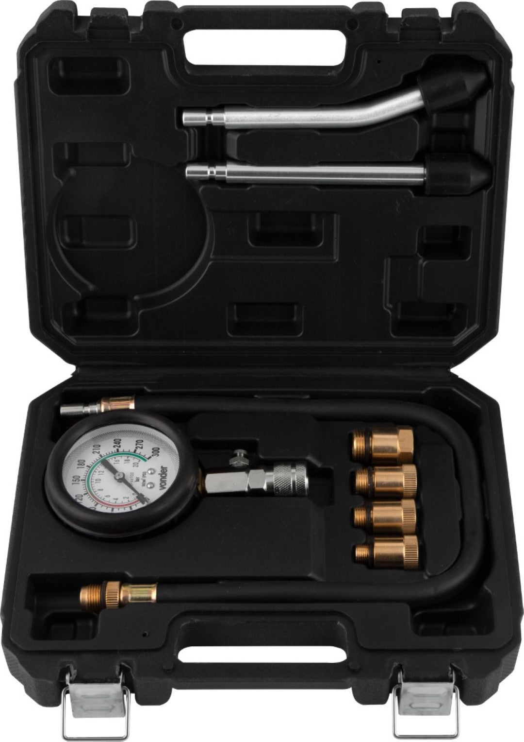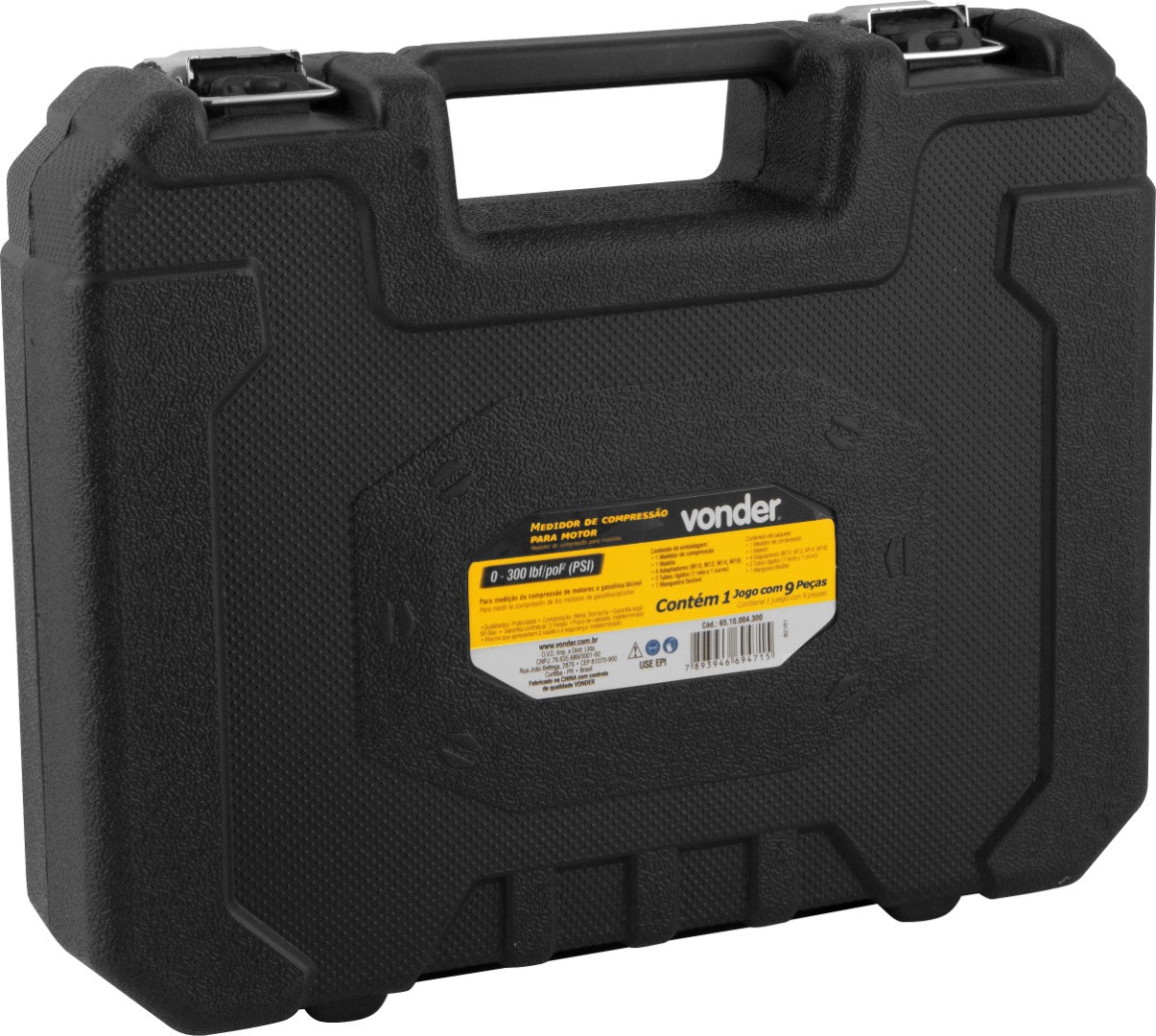 Conteúdo da embalagem: 1 Medidor de compressão. Acompanha: 1 maleta, 4 adaptadores: M10, M12, M14, M18, 1 mangueira flexível e 2 tubos rígidos 1 reto e 1 curvo.