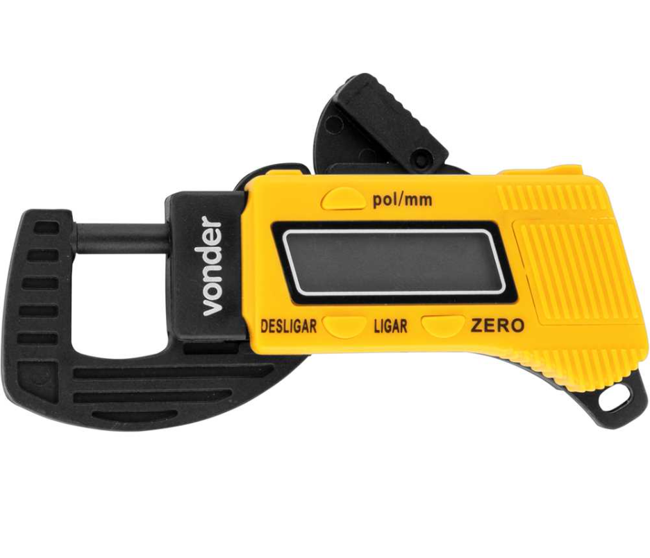 Produto leve, prático e compacto. Confeccionado em plástico e alimentado por uma bateria modelo LR44 - 1,55 V (já inclusa). Realiza medições nas unidades de medida "mm" e "polegada".