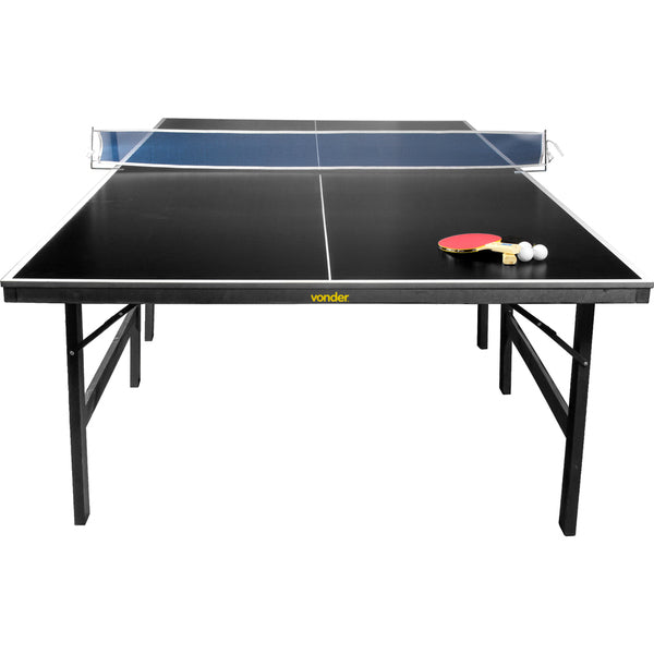 1 Mesa de pingue-pongue, acompanha: 1 rede, 2 suportes para rede, 2 raquetes e 3 bolas