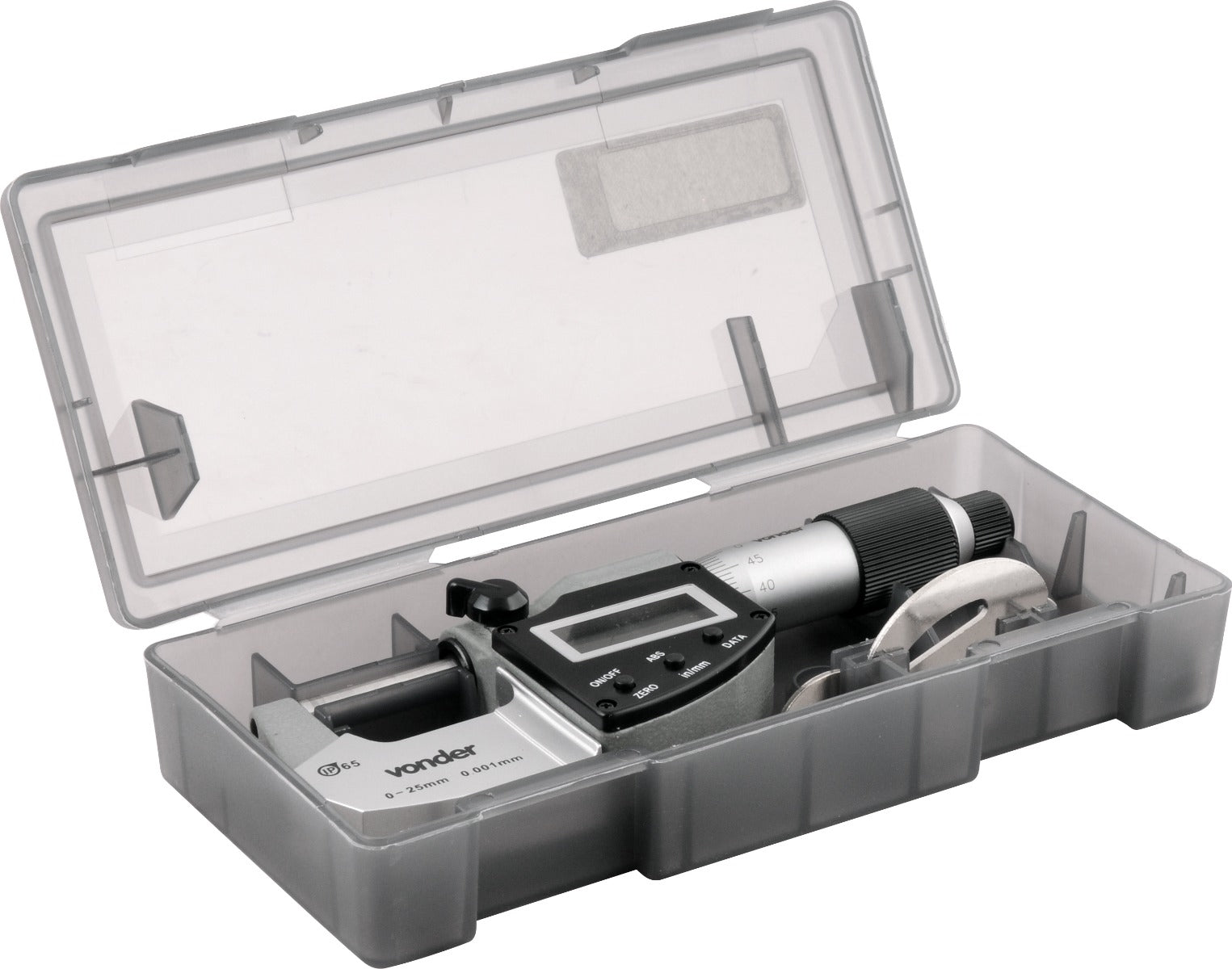1 Micrômetro externo digital. Acompanha: 1 chave de ajuste e 1 chave auxiliar para abertura da tampa da bateria.