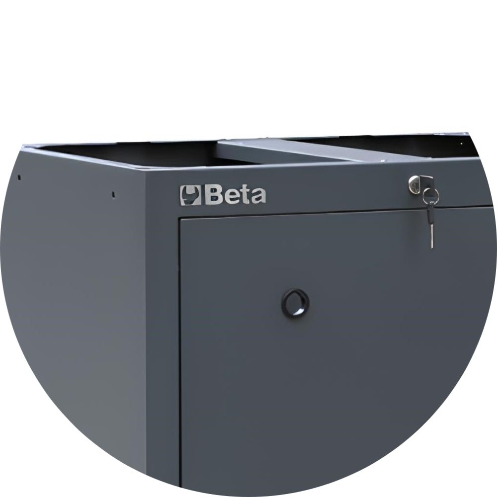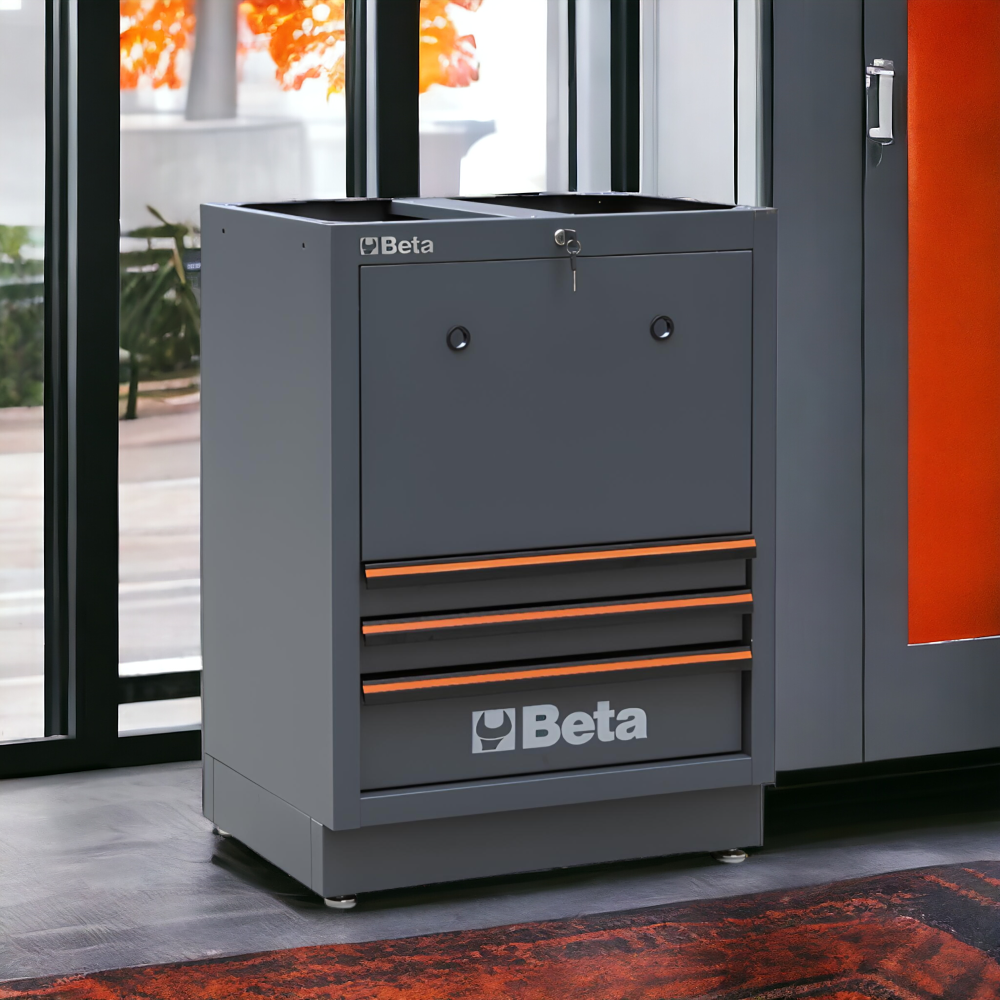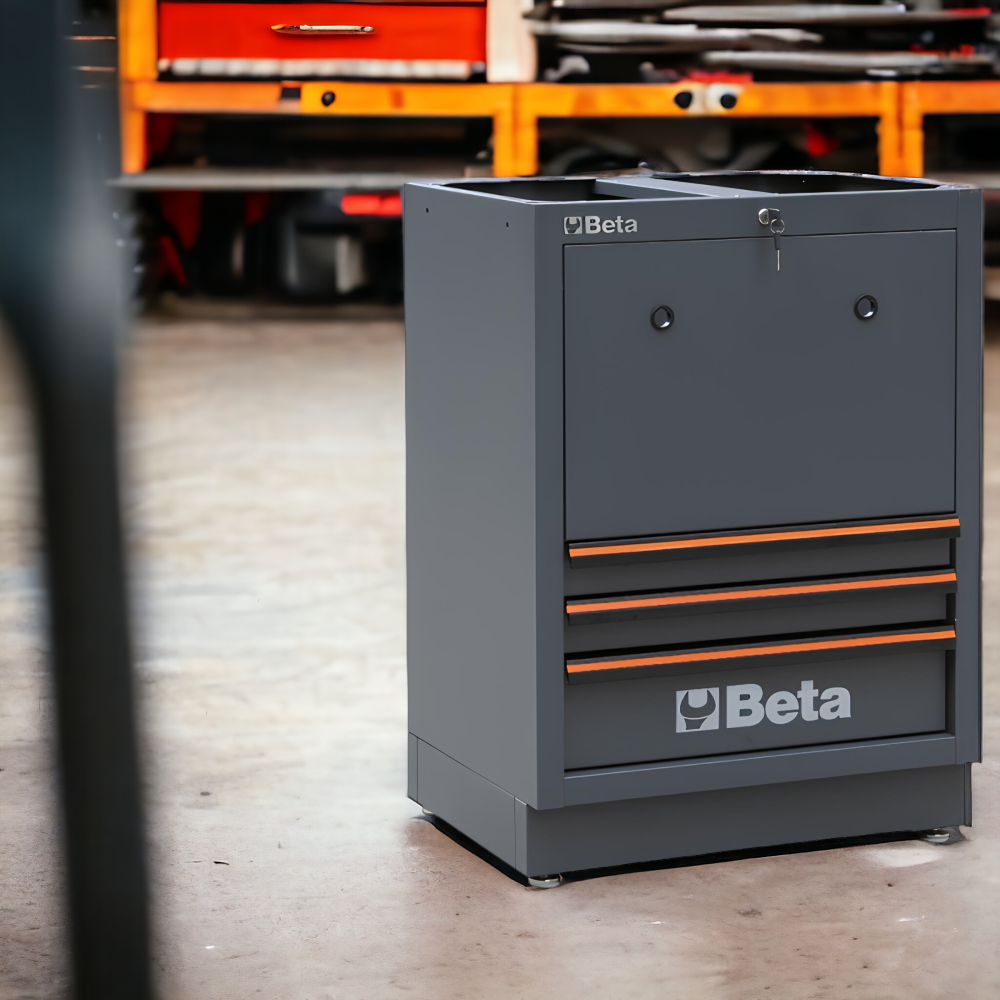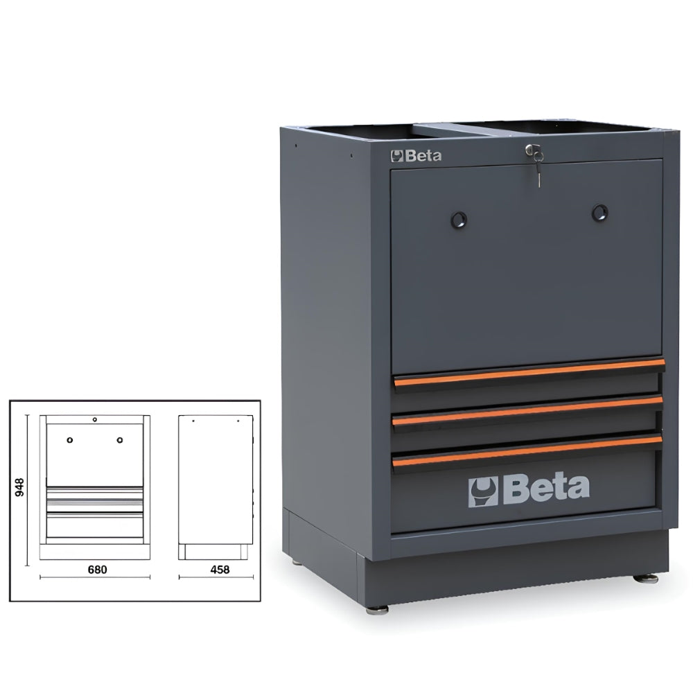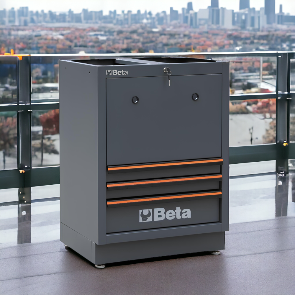 O módulo C45PRO TC é um componente versátil e funcional para combinação de mobiliário modular na oficina C45PRO. Este módulo inclui três gavetas e a capacidade de acomodar bobinas, sendo ideal para a organização e fácil acesso a ferramentas e cabos.