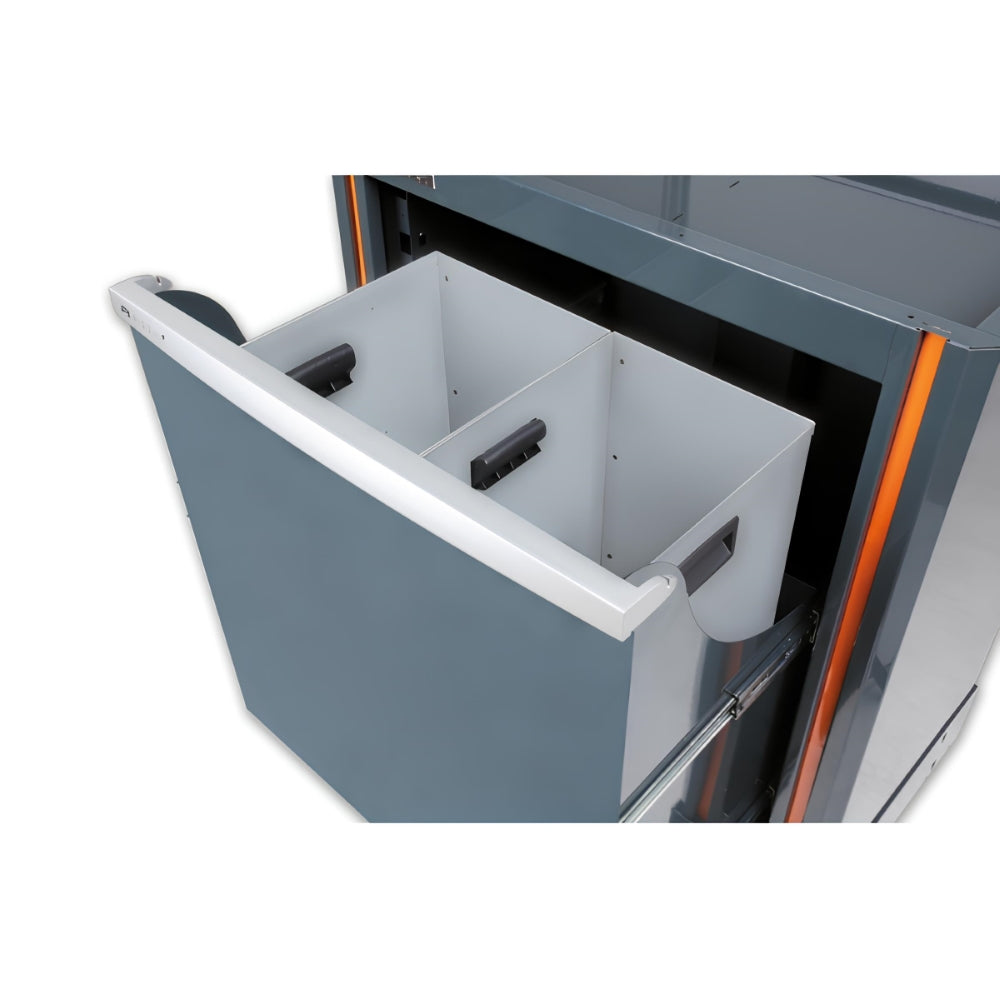 O módulo C55CS é uma solução prática e eficiente para a coleta seletiva de resíduos, projetado para ser integrado a combinações de móveis modulares de oficina. Ele oferece um compartimento organizado e fácil de usar, permitindo a separação e descarte adequado de diferentes tipos de resíduos.