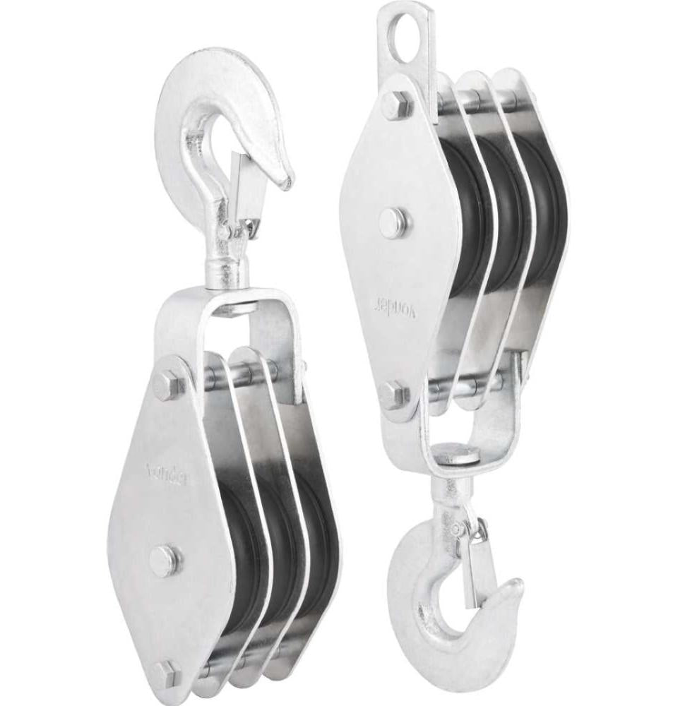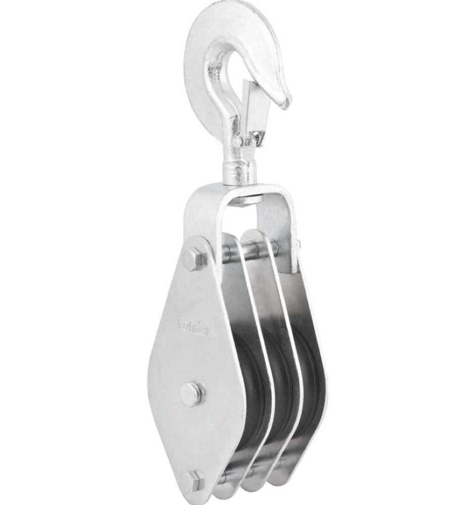 Possui acabamento zincado, proporcionando maior resistência a oxidação/corrosão, gancho com trava proporcionando maior segurança e polias de nylon de alto impacto proporcionando maior durabilidade.