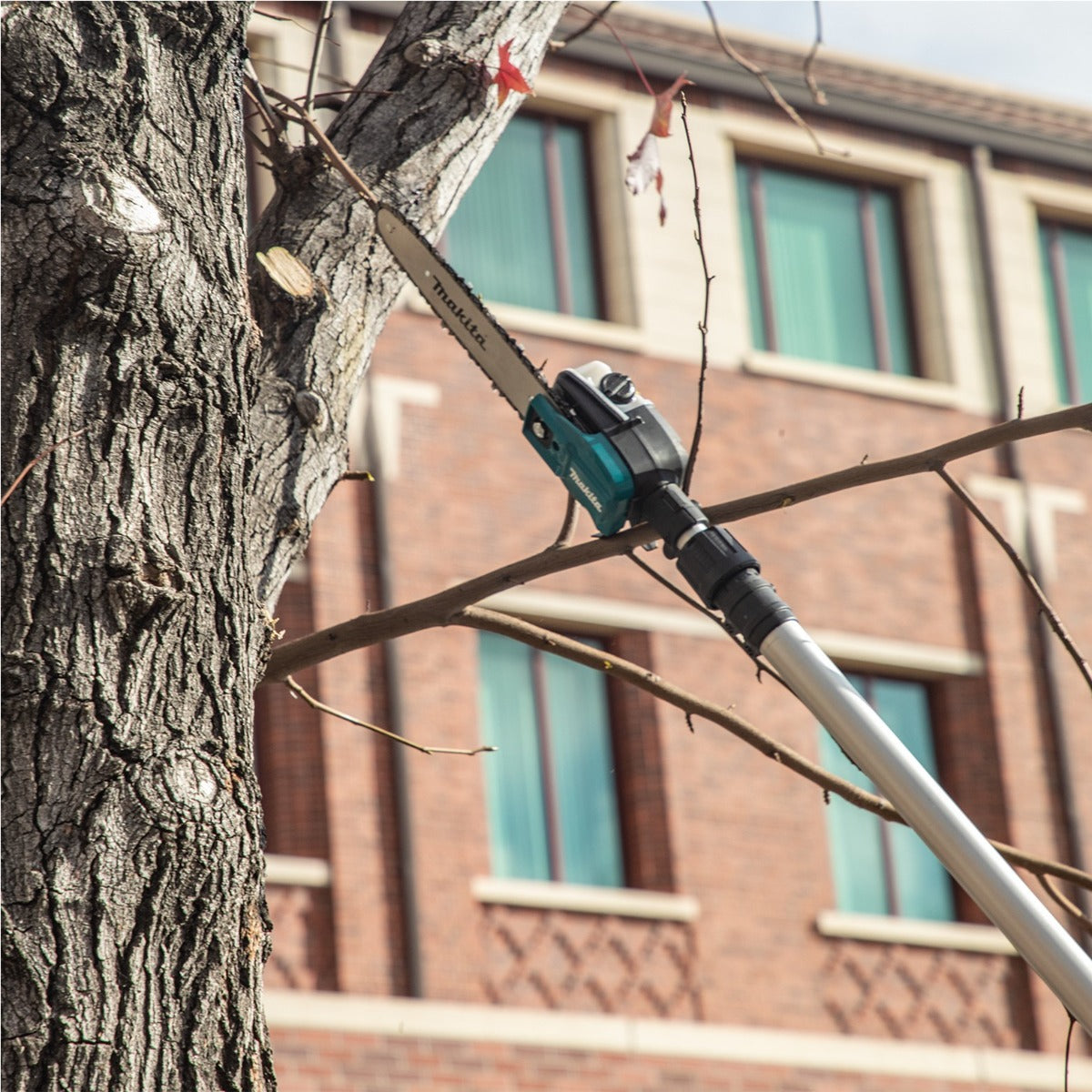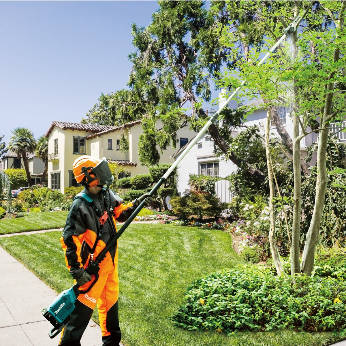 A Motopoda DUA301PT2 da Makita é equipada com um Motor BL de alta potência, oferecendo eficiência comparável a modelos a combustão de 30 cm³. Com uma velocidade de corrente competitiva, proporciona cortes confortáveis. O modo Boost permite cortar troncos ou galhos grossos com facilidade. Sua ponteira de corte é projetada para facilitar cortes em altura e evitar enroscos. Ideal para poda de árvores altas, o alcance máximo é de até 5,5 m com o tubo telescópico. A tampa do tanque de óleo retrátil evita que o cabeçote de corte fique preso, e o tanque de óleo transparente permite fácil visualização do nível. Inclui um gancho de galho integrado e conta com as tecnologias XPT e AFT, garantindo resistência à poeira e água e proteção do motor em caso de redução súbita de rotação. A motopoda opera com duas baterias de íon de lítio 18V LXT, proporcionando potência e desempenho.