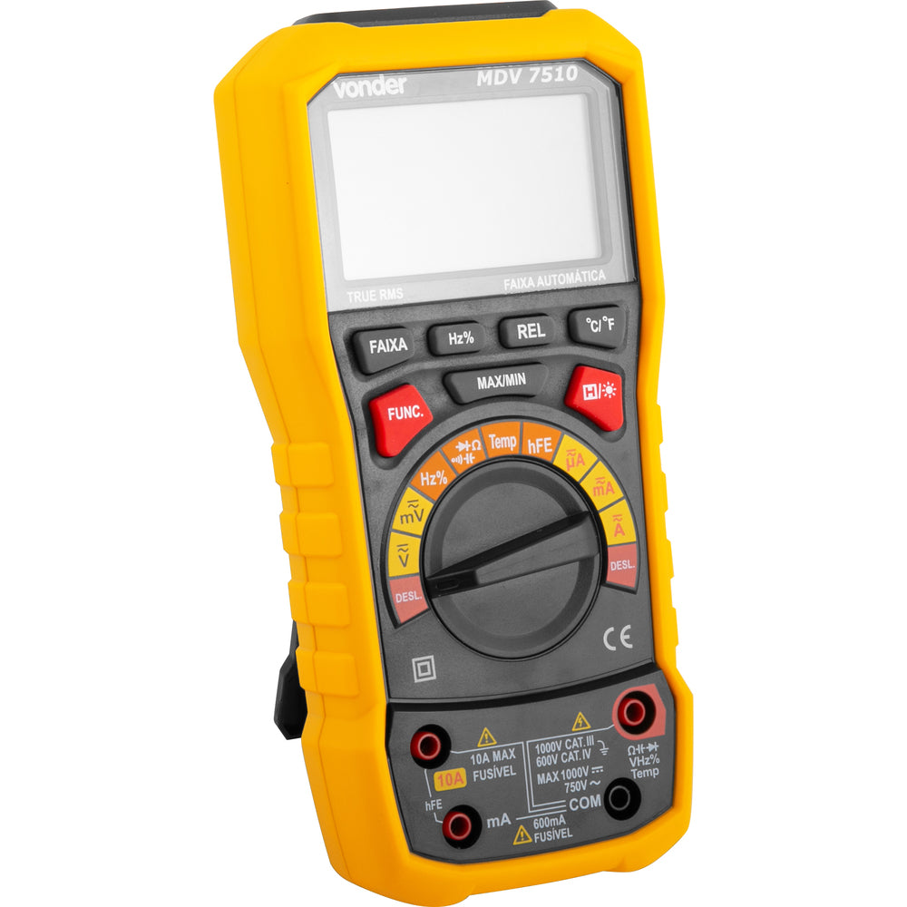 Instrumento True RMS (medições de sinais senoidais e não senoidais) obtendo valor eficaz verdadeiro para qualquer tipo de sinal em corrente alternada. Possui faixa automática. Instrumento de categoria IV 600 V /III 1.000 V.