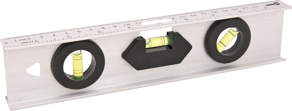 Possui corpo em alumínio, conferindo maior leveza e 3 bolhas, sendo uma para nivelamento vertical, uma para nivelamento horizontal e uma para nivelamento 45°.
