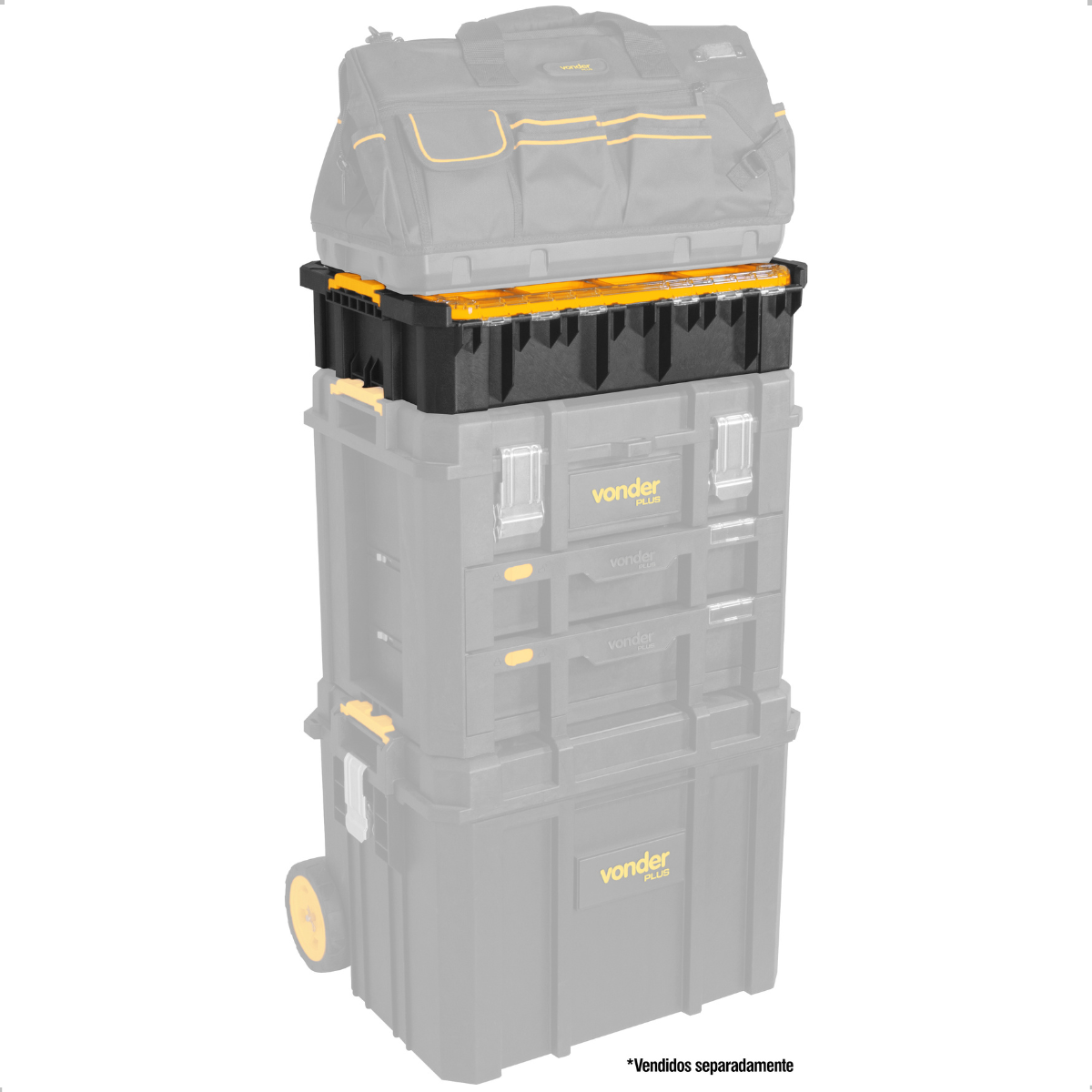 Outro diferencial de destaque é a compatibilidade com a linha modular Vonder Plus. O OPV 900 pode ser acoplado à Bolsa em Lona BL 900, à Caixa Plástica CPV 900 e à Caixa com Rodas CRV 900 (vendidas separadamente), permitindo montar um sistema completo de organização móvel — perfeito para profissionais que estão sempre em trânsito ou que precisam manter o ambiente de trabalho otimizado.