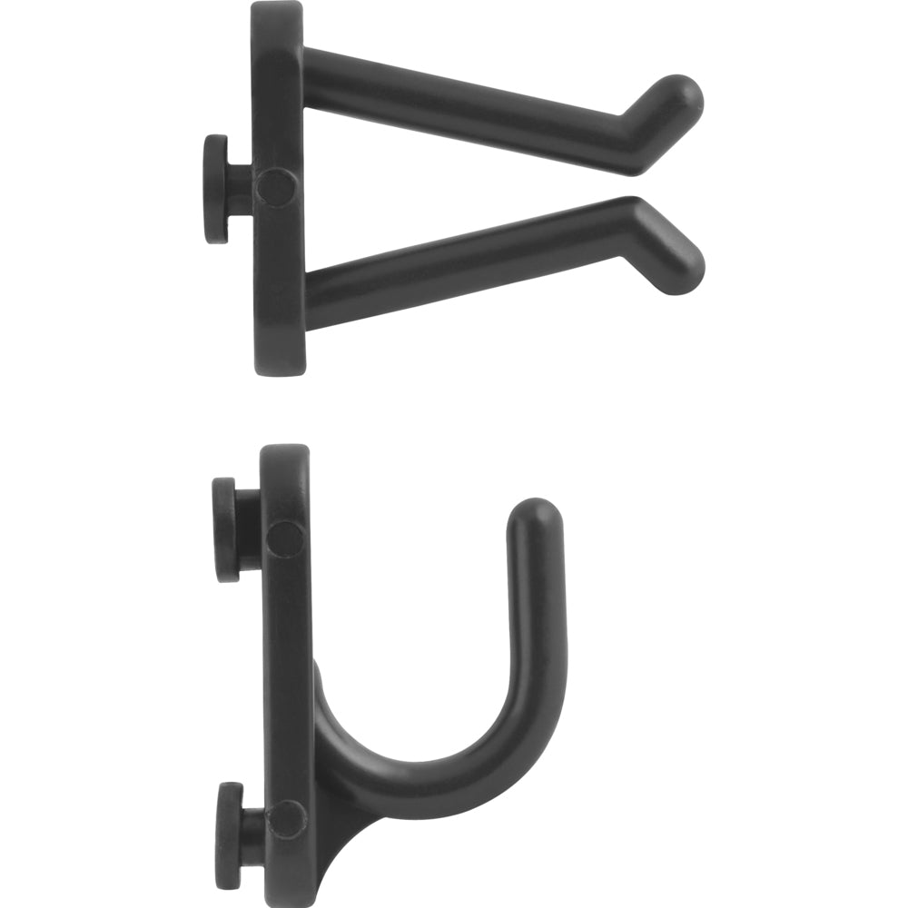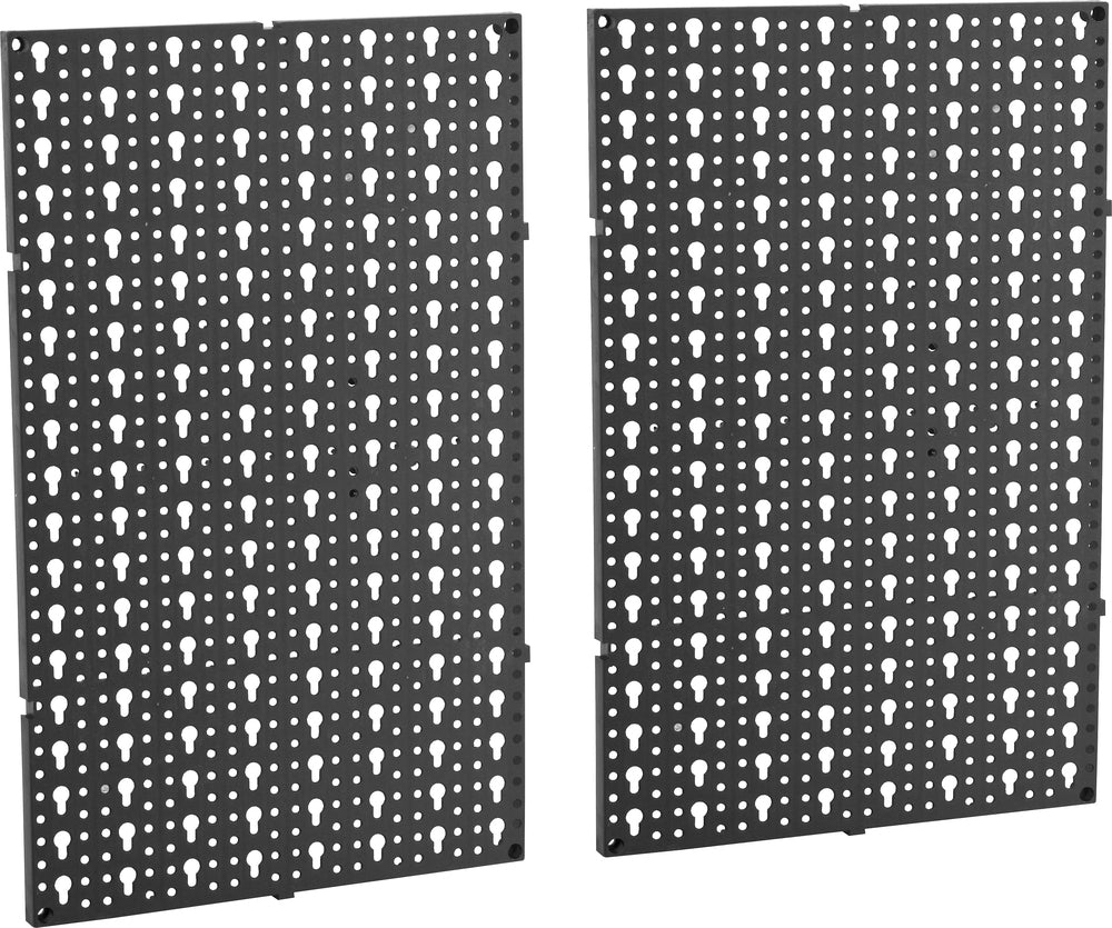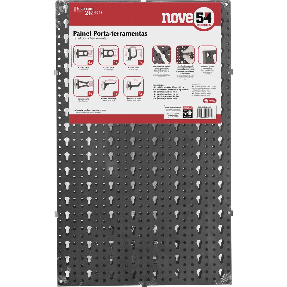 1 Painel porta-ferramentas com 26 peças, sendo: 2 painéis 30 cm x 49 cm, 8 ganchos olhal, 4 ganchos curvos, 2 ganchos duplos e 10 ganchos retos (não acompanham parafusos e ferramentas)
