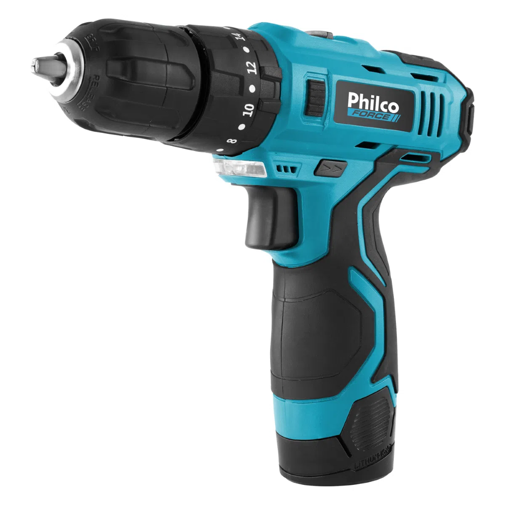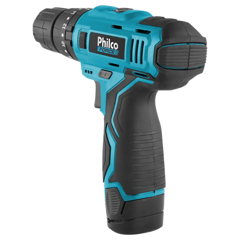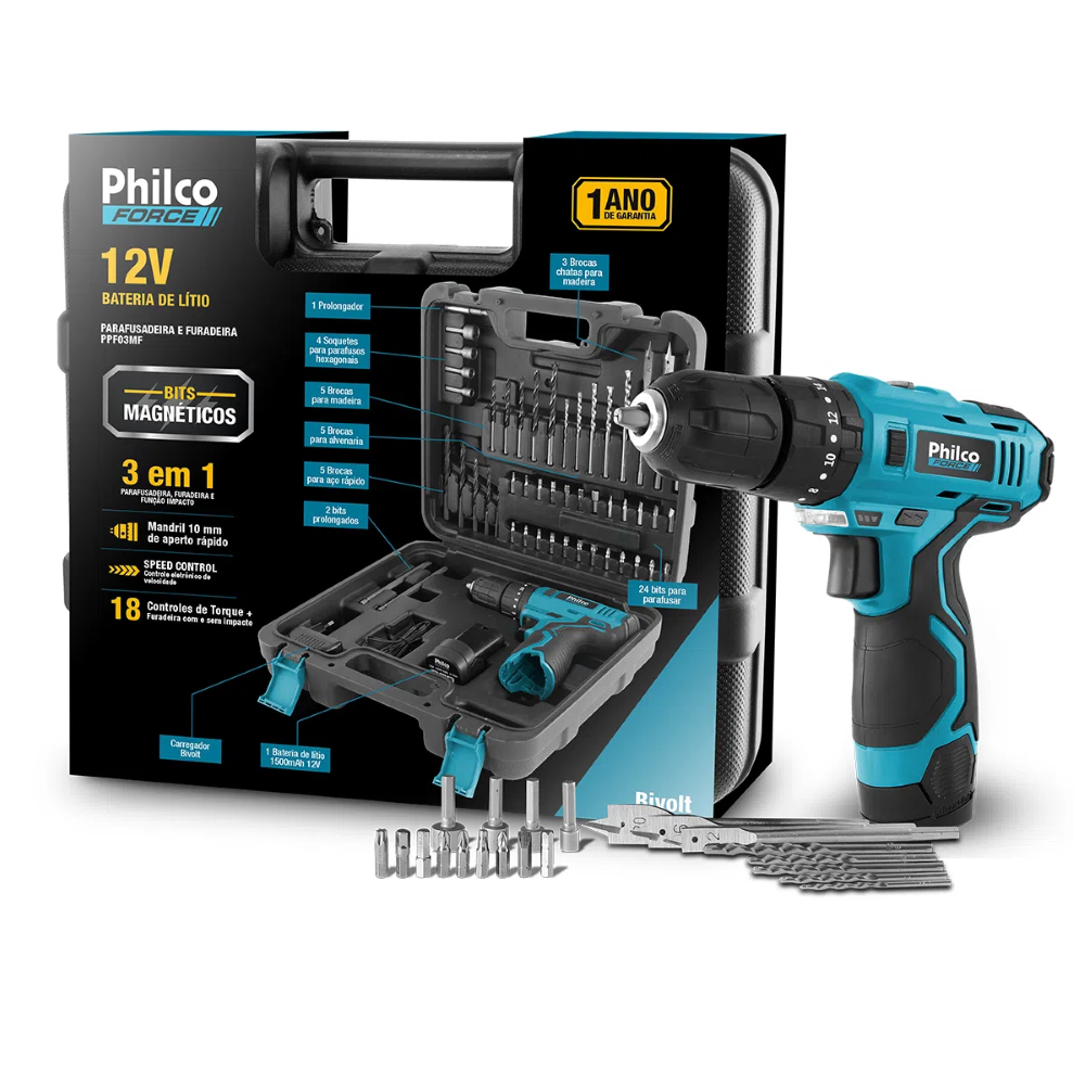 Conteúdo da embalagem: 1 Parafusadeira Furadeira 3/8 Philco Force PPF03MF 12V Sem Fio a Bateria com Maleta e Acessórios