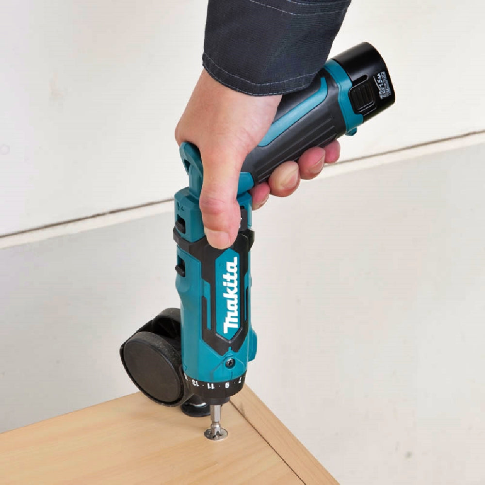 A PARAFUSADEIRA / FURADEIRA 5MM A BATERIA 7.2V DF012DSE da Makita é uma ferramenta versátil alimentada por uma bateria de lítio 7.2V 1.5 Ah. Com freio instantâneo, partida suave, rotação reversível, 2 velocidades mecânicas, 21 níveis de torque e iluminação de trabalho, proporciona praticidade e eficiência em diversas aplicações.