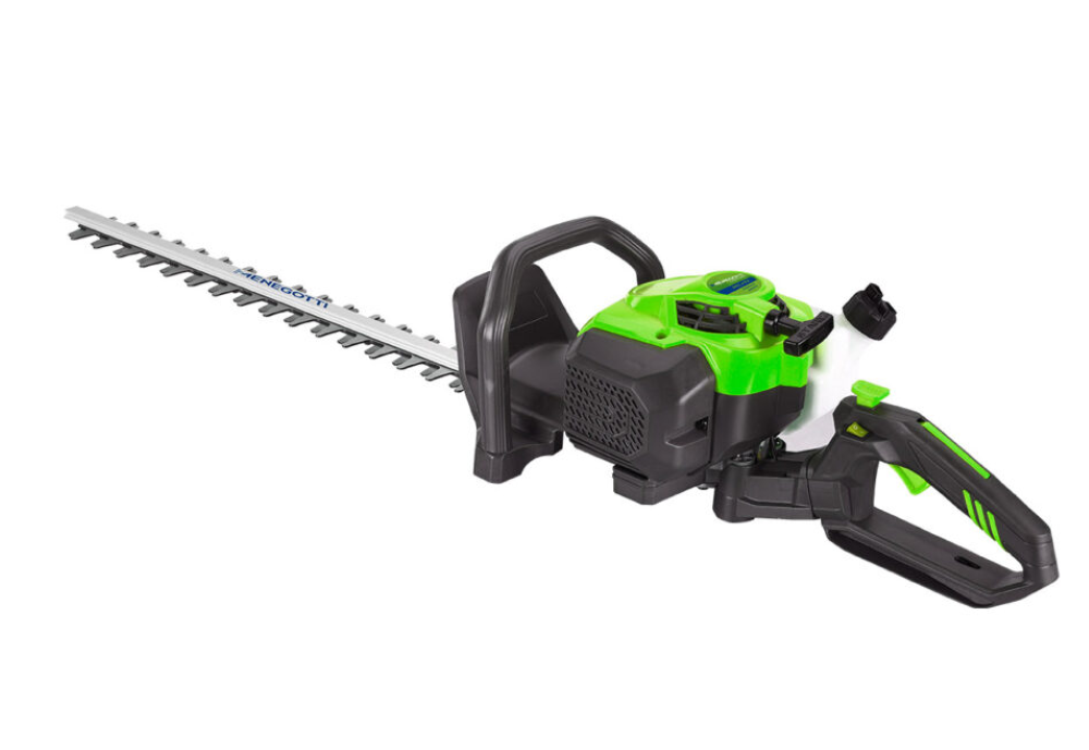 Possui lâmina dupla, auto afiáveis, para acabamento em arbustos, pequenas cercas vivas e bordas de gramado.
