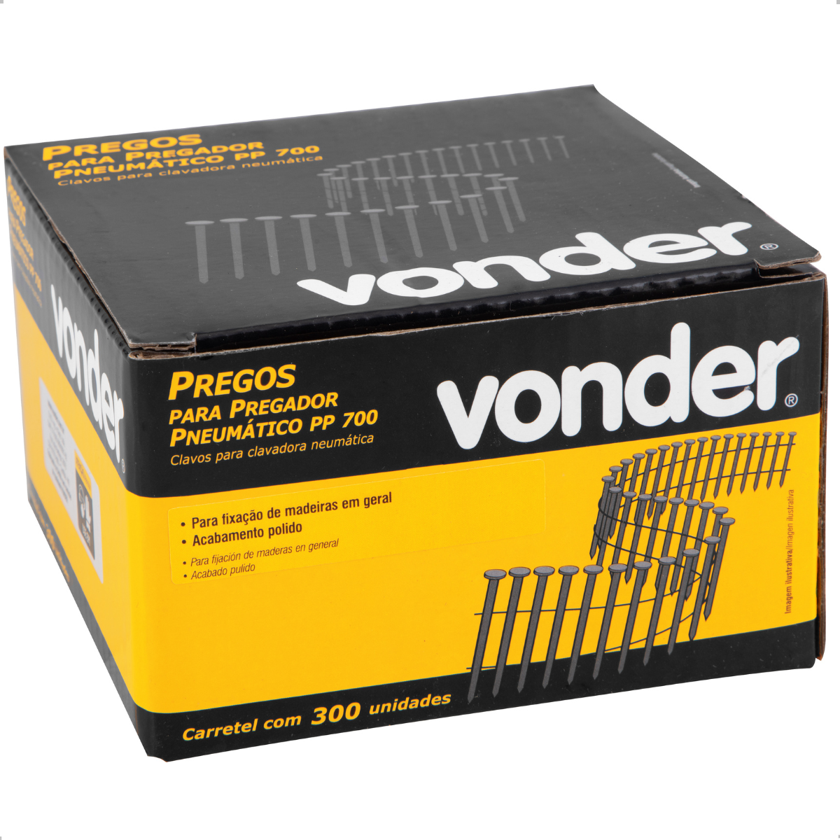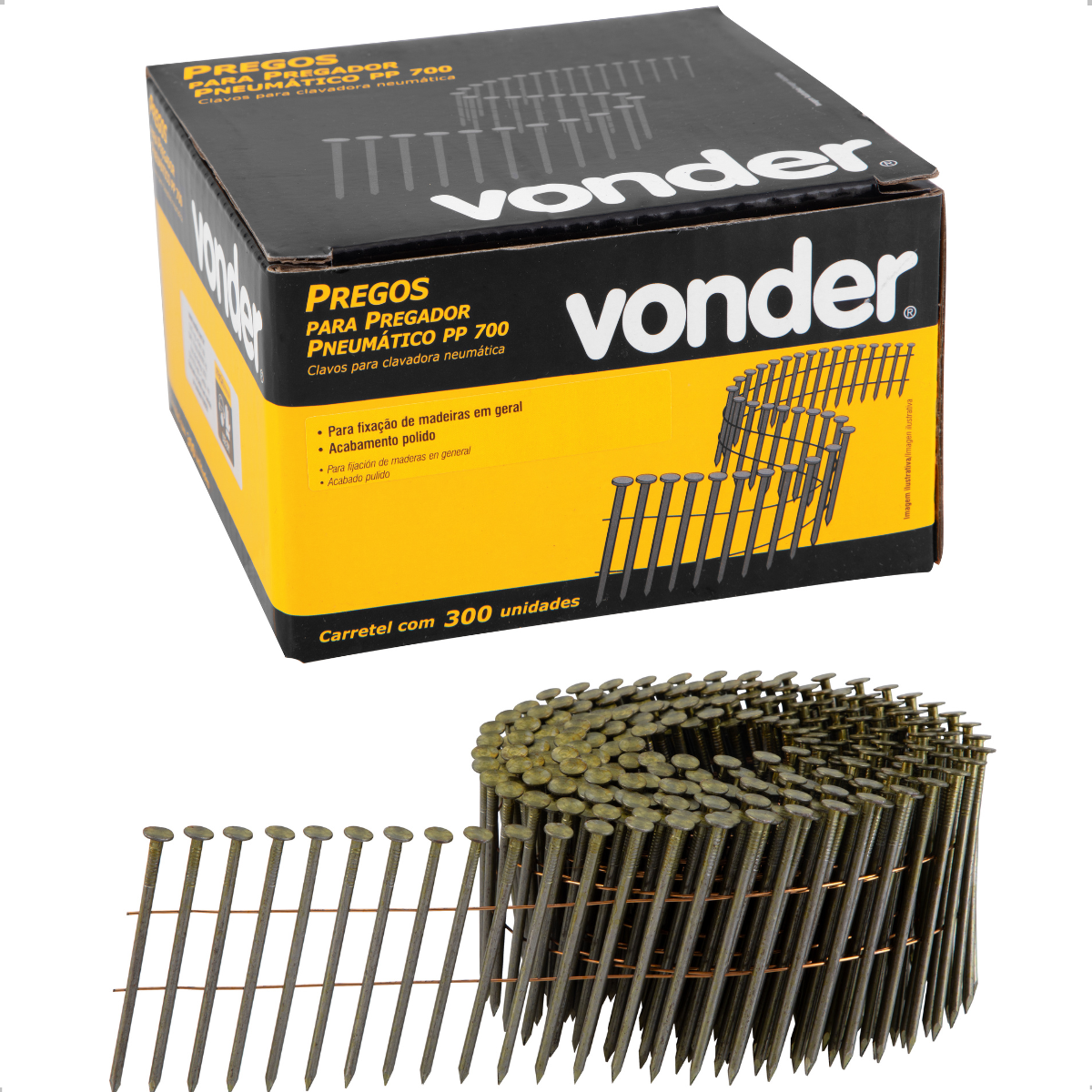 O carretel com 300 unidades oferece excelente rendimento para profissionais que desejam aumentar a produtividade e automatizar seus sistemas de fixação, otimizando o tempo de trabalho sem perder a qualidade nos detalhes. E mesmo sendo projetado para o modelo PP 700 da Vonder, pode ser utilizado em outros pregadores compatíveis com as mesmas especificações, desde que se respeite o diâmetro e o comprimento dos pregos.