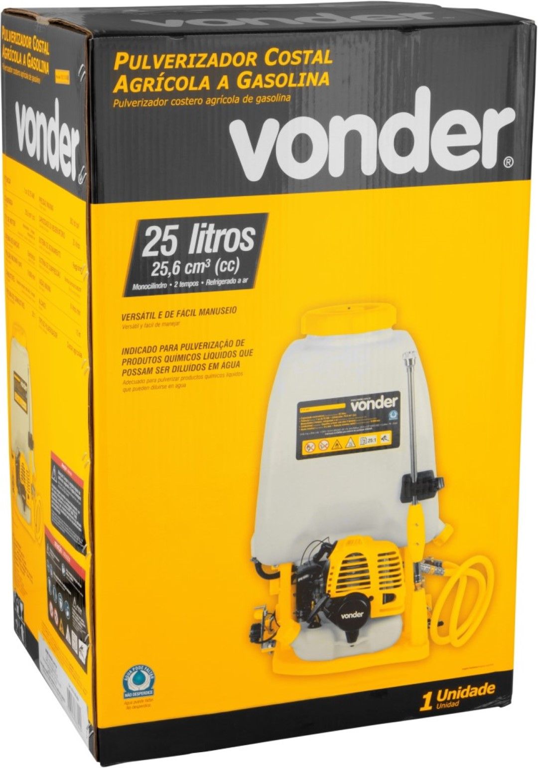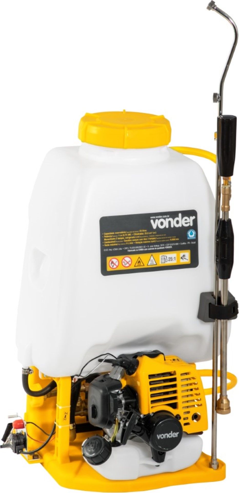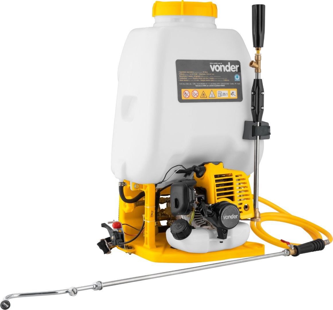 Conteúdo da embalagem: 1 Pulverizador. Acompanha: 1 extensão, 1 lança com 2 bicos leque, 1 lança reta com regulador e bico cônico, 1 mangueira de pressão, 1 empunhadura, 1 kit de vedação, 1 chave de vela, 1 frasco dosador, 1 alça costal, 1 chave allen 10 mm, 1 chave allen 6 mm e 1 chave phillips.
