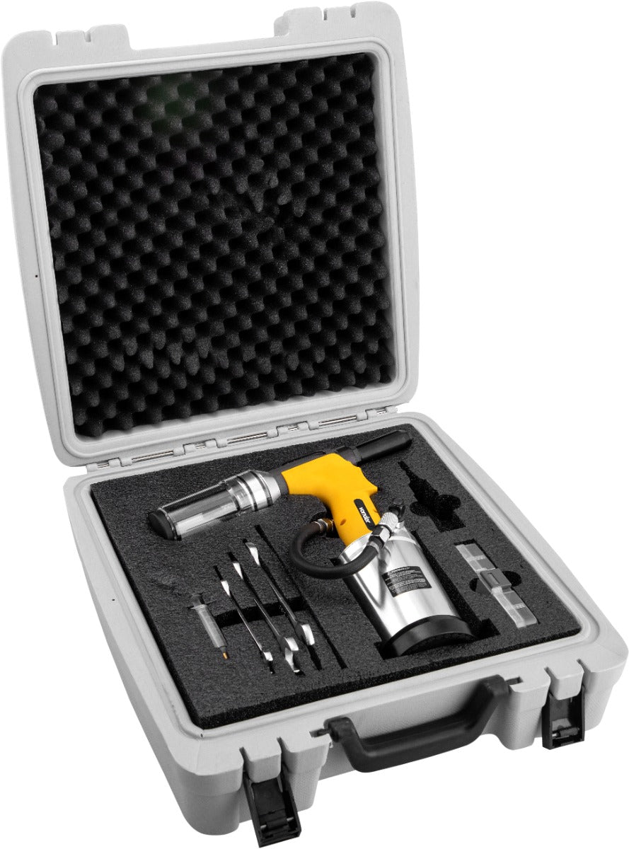 Agiliza o processo de rebitagem, garantindo maior produtividade com menor esforço ao operador. Possui sistema de sucção e reservatório que coleta o mandril do rebite após a utilização, conferindo maior limpeza e segurança ao ambiente de trabalho.