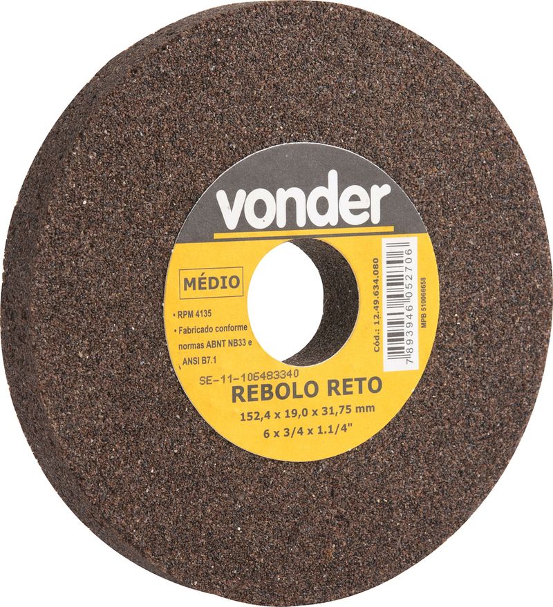 Diâmetro do rebolo 6" - 152 mm Espessura do rebolo: 3/4" - 19,0 mm Diâmetro do furo do rebolo: 1.1/4" - 31 mm Cor do rebolo: Marrom Grão: G 60 Tipo de grão abrasivo: Óxido de alumínio Dureza do rebolo: N