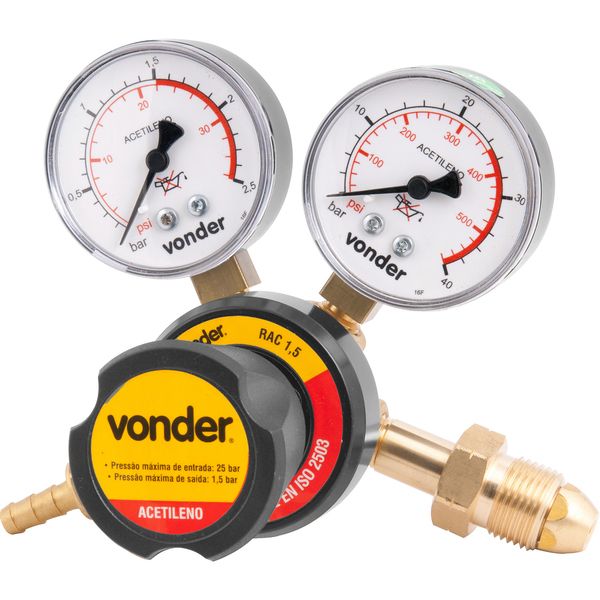 Tipo de gás do regulador de pressão para gases de solda Acetileno Pressão máxima de entrada: 25 bar Pressão máxima de saída: 1,5 bar Escala do manômetro de entrada do regulador de pressão para gases de solda: 0 - 40 bar / 0 - 600 Lbf/pol² (Psi) Escala do manômetro de saída do regulador de pressão para gases de solda: 0 - 2,5 bar / 0 - 35 Lbf/pol² (Psi) Diâmetro do manômetro do regulador de pressão para gases de solda: 63,5 mm