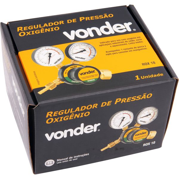 Conteúdo da embalagem 1 Regulador de pressão. Acompanha: 1 conjunto de porca e niple para conexão em mangueiras. Aplicações e dicas de uso Indicado para uso com oxigênio em aplicações industriais de solda, corte e aquecimento. Linha média. Destaques e diferenciais Possui corpo em latão forjado e capa em alumínio injetado com pintura epóxi, proporcionando maior resistência. Atende as exigências das normas EN-2503 / ABNT 14250 / ABNT 218-1 e CGA E1-23.