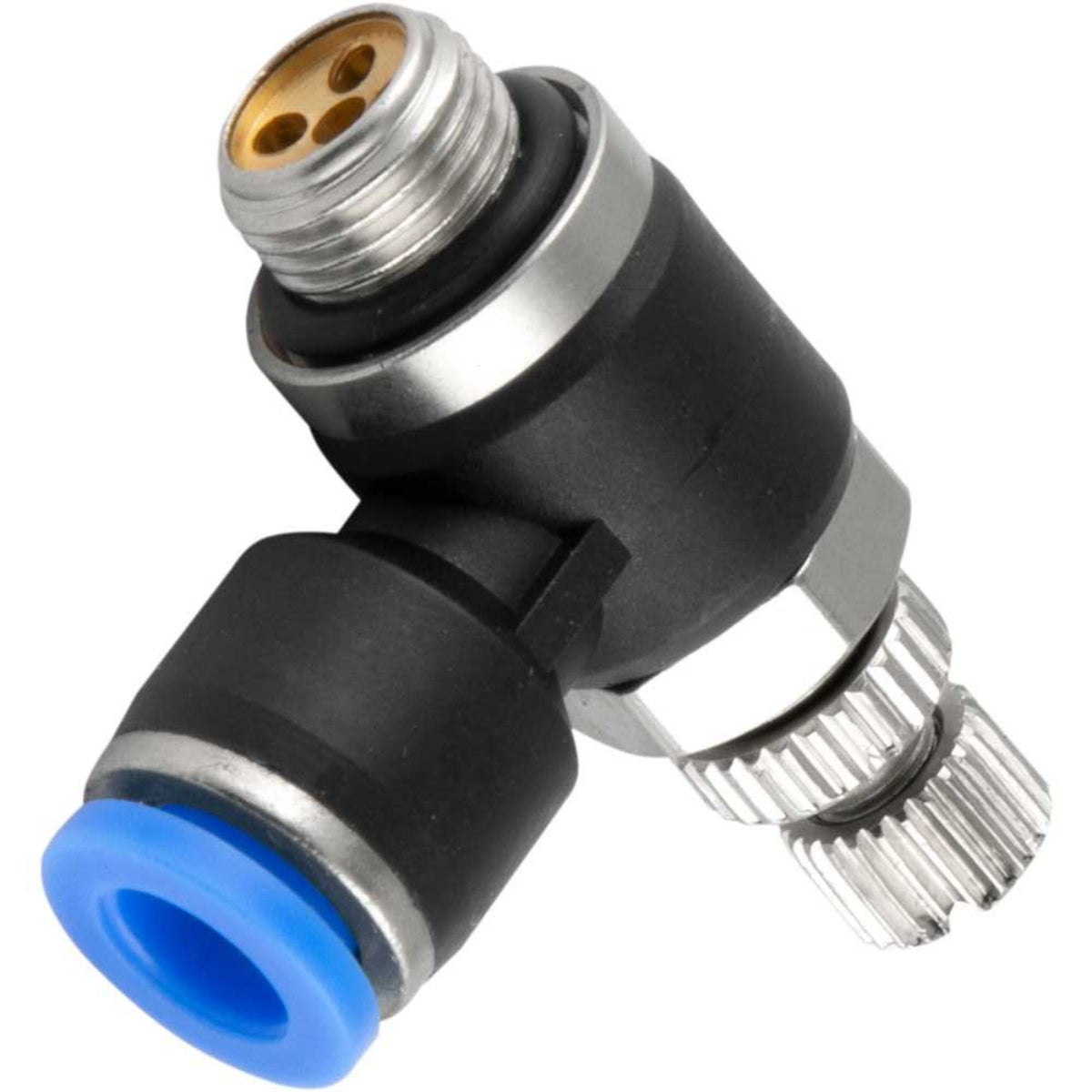 Regulador de velocidade com rosca BSP e engate rápido, usado em tubos PU de ar comprimido.