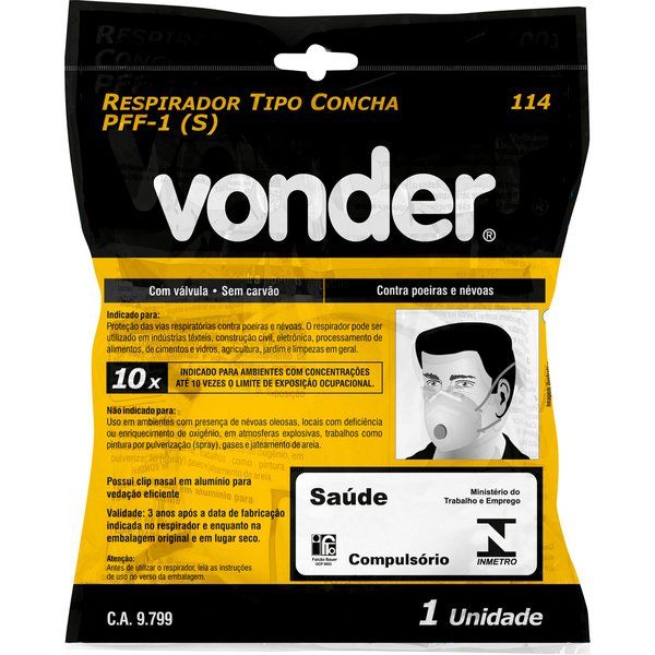 Aplicações e dicas de uso Possui clipe nasal em alumínio para vedação mais eficiente e válvula de exalação que ajuda na expiração, proporcionando maior conforto Utilizado para confecção de lingas de cabos de aço, substitui os grampos em configurações que dispensam desmontagens. É recomendado o uso de alicate especial para prensagem. Indicado para proteção das vias respiratórias contra poeiras e névoas não superiores a 10 (dez) vezes o limite de exposição ocupacional (LT ou TLV) deste particulado (penetração máxima através do filtro de 20%). O respirador pode ser utilizado em indústrias têxteis, construção civil, eletrônica, processamento de alimentos, de cimentos e vidros, agricultura, jardim e limpezas em geral.