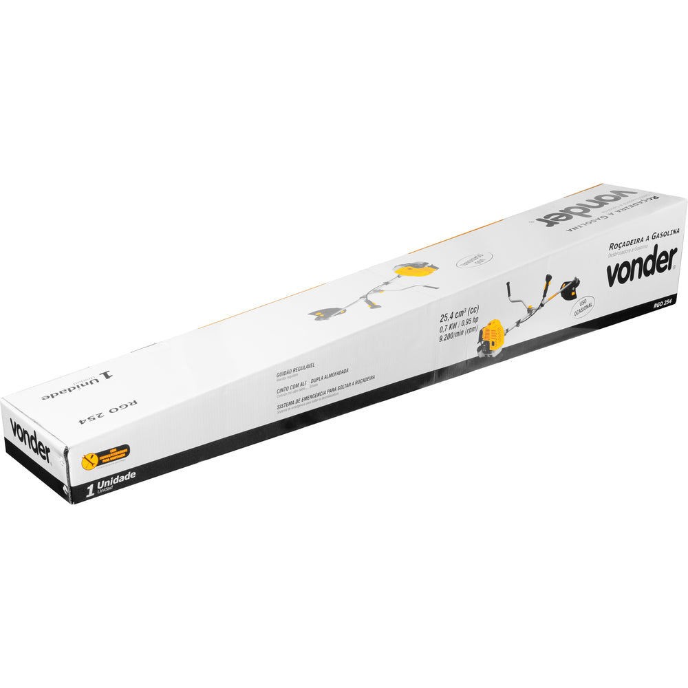 Possui guidão regulável e cinto com alça dupla almofadada, conferindo maior conforto ao operador e melhor distribuição do peso do equipamento. Conta ainda com sistema de emergência caso seja necessário soltar a roçadeira, além de frasco graduado que facilita a medição/mistura de gasolina e óleo 2 tempos. Equipamento pronto para uso, pois já acompanha lâmina três pontas e carretel com fio de nylon.