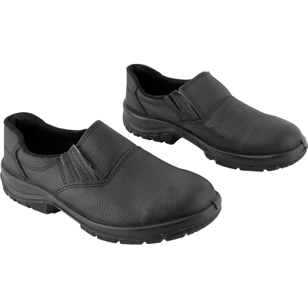 Calçado ocupacional de uso profissional, tipo sapato, fechamento em elástico lateral, confeccionado em couro curtido ao cromo, palmilha de montagem em material sintético fixada pelo sistema strobel, contraforte em material sintético, biqueira termoconformada, solado em poliuretano bidensidade, antiderrapante.
