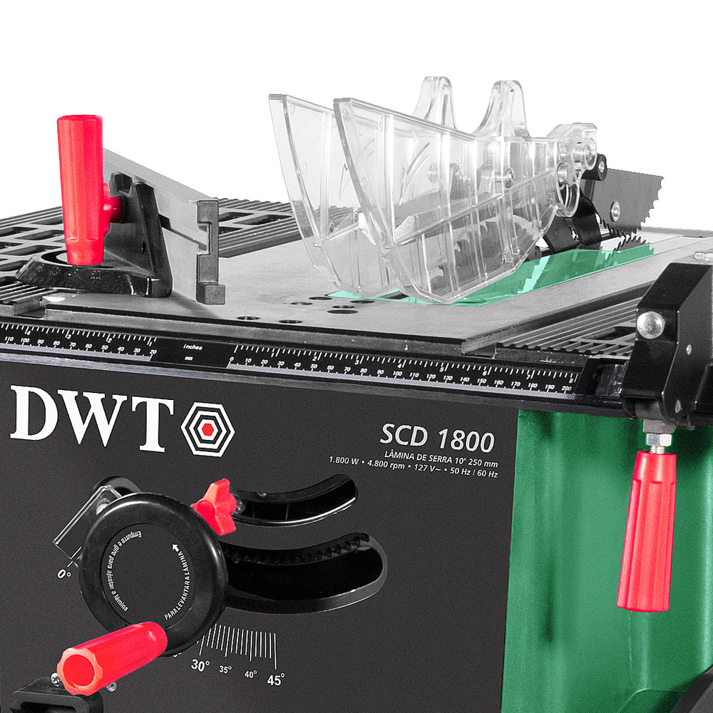 Possui guia lateral, esquadro para ângulos, proteção da lâmina em acrílico e regulagem de ângulo e de altura da serra