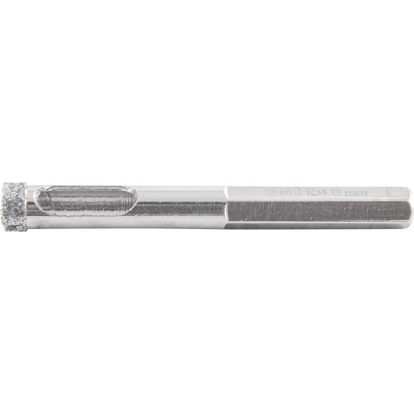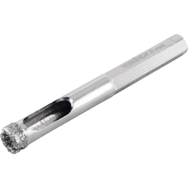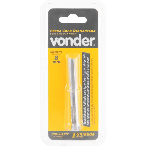 Possui corpo reforçado em aço, aresta de corte com revestimento diamantado e haste sextavada