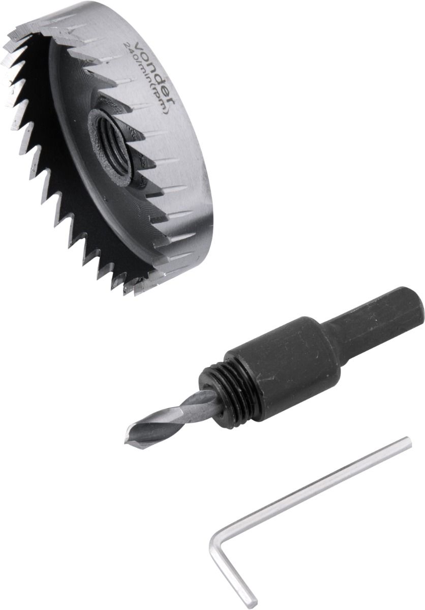 1 Serra copo. Acompanha: 1 haste, 1 broca piloto de 6 mm, 1 chave allen de 2,5 mm.