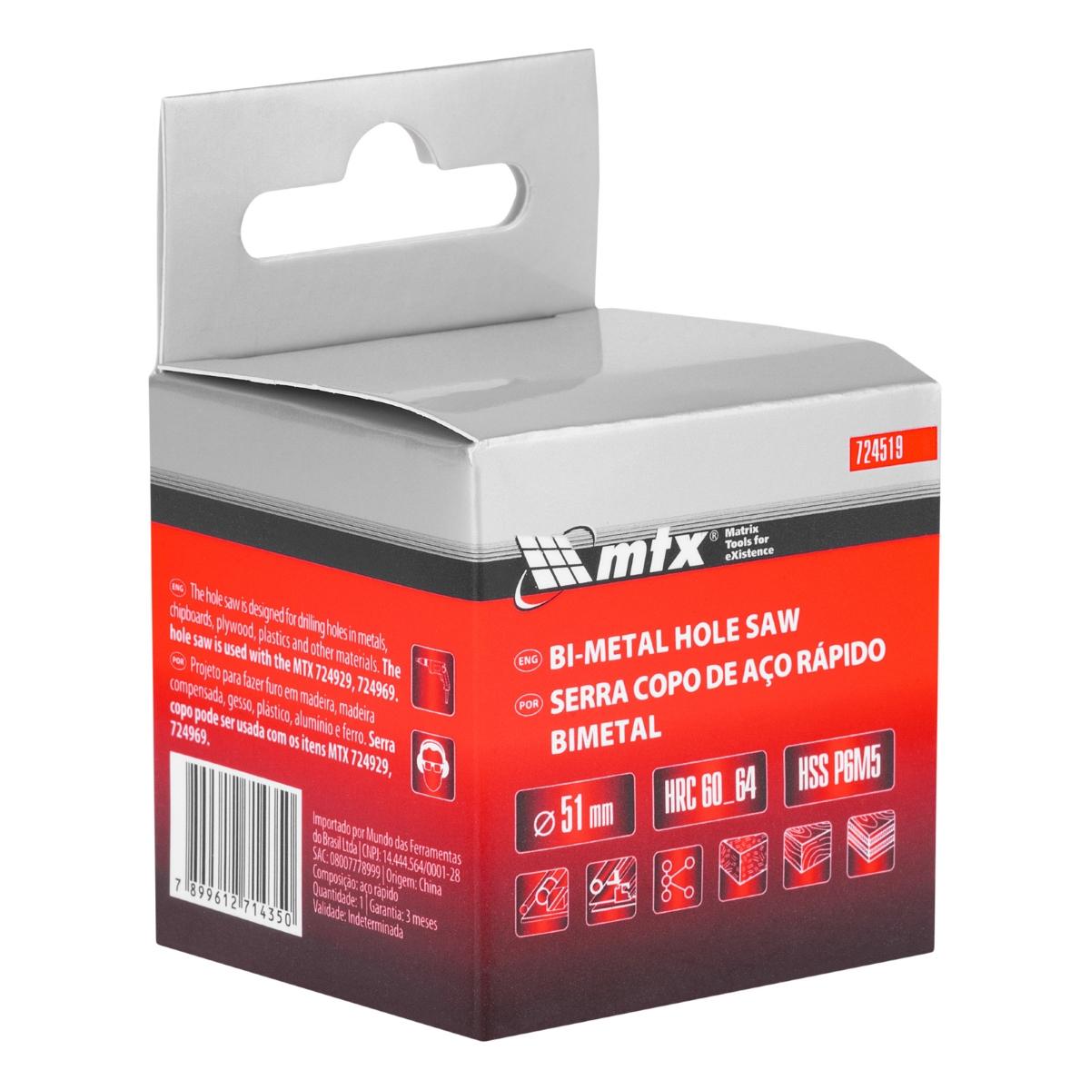 A Serra Copo MTX BIMETAL 724519 de 51mm é a solução ideal para quem busca eficiência e precisão em cortes de diversos materiais. Projetada para ser utilizada em brocas, martelos perfuradores ou máquinas estacionárias, esta serra copo garante perfurações rápidas e limpas em metais (ferrosos e não ferrosos), plásticos, madeira e outros. Sua construção robusta em aço carbono e dentes soldados eletricamente asseguram durabilidade e resistência, mesmo em trabalhos pesados. Ideal para profissionais que atuam em instalações elétricas, sistemas de comunicação ou em projetos que exigem furos de grande diâmetro, a Serra Copo MTX BIMETAL oferece um desempenho superior e é compatível com diversos tipos de mandris, incluindo opções hexagonais e SDS PLUS (vendidos separadamente). Invista em uma ferramenta que otimiza seu tempo e garante resultados impecáveis em cada aplicação.