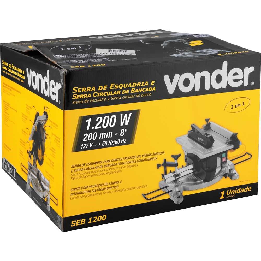 Une 2 equipamentos em 1, sendo a Serra de Esquadria para cortes precisos em vários ângulos e a Serra Circular de Bancada para cortes longitudinais. Possui base giratória para cortes em ângulo de 45° para ambos os lados, braço (cabeça de corte) com botão para regulagem de inclinação de até 45° para a esquerda, cabo com revestimento emborrachado e protetor de lâmina. Possui ainda, morsa e apoios laterais que facilitam o corte em peças de maior comprimento. Conta também com proteção de lâmina e interruptor eletromagnético, que desliga automaticamente o equipamento em caso de queda ou falta de energia durante o uso e, após restabelecida a energia, o interruptor deve ser religado, proporcionando maior segurança e praticidade ao operador. Dimensões da bancada: 340 mm x 225 mm. Altura máxima de corte da Serra de Bancada: 30 mm.
