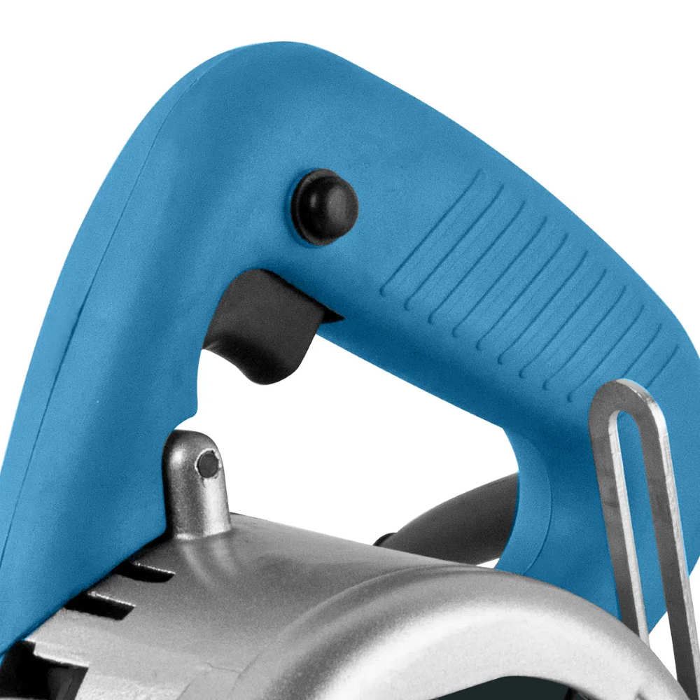 Pode se usar disco diamantado de até 4.3/8" com disco diamantado de 110 mm segmentado para corte de mármores, granitos e pedras. Junto com a serra mármore acompanha uma chave para fazer a troca do disco. Sua estrutura é compacta, leve e portátil.