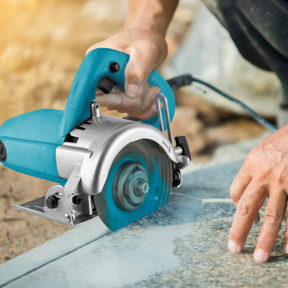 Pode se usar disco diamantado de até 4.3/8" com disco diamantado de 110 mm segmentado para corte de mármores, granitos e pedras. Junto com a serra mármore acompanha uma chave para fazer a troca do disco. Sua estrutura é compacta, leve e portátil