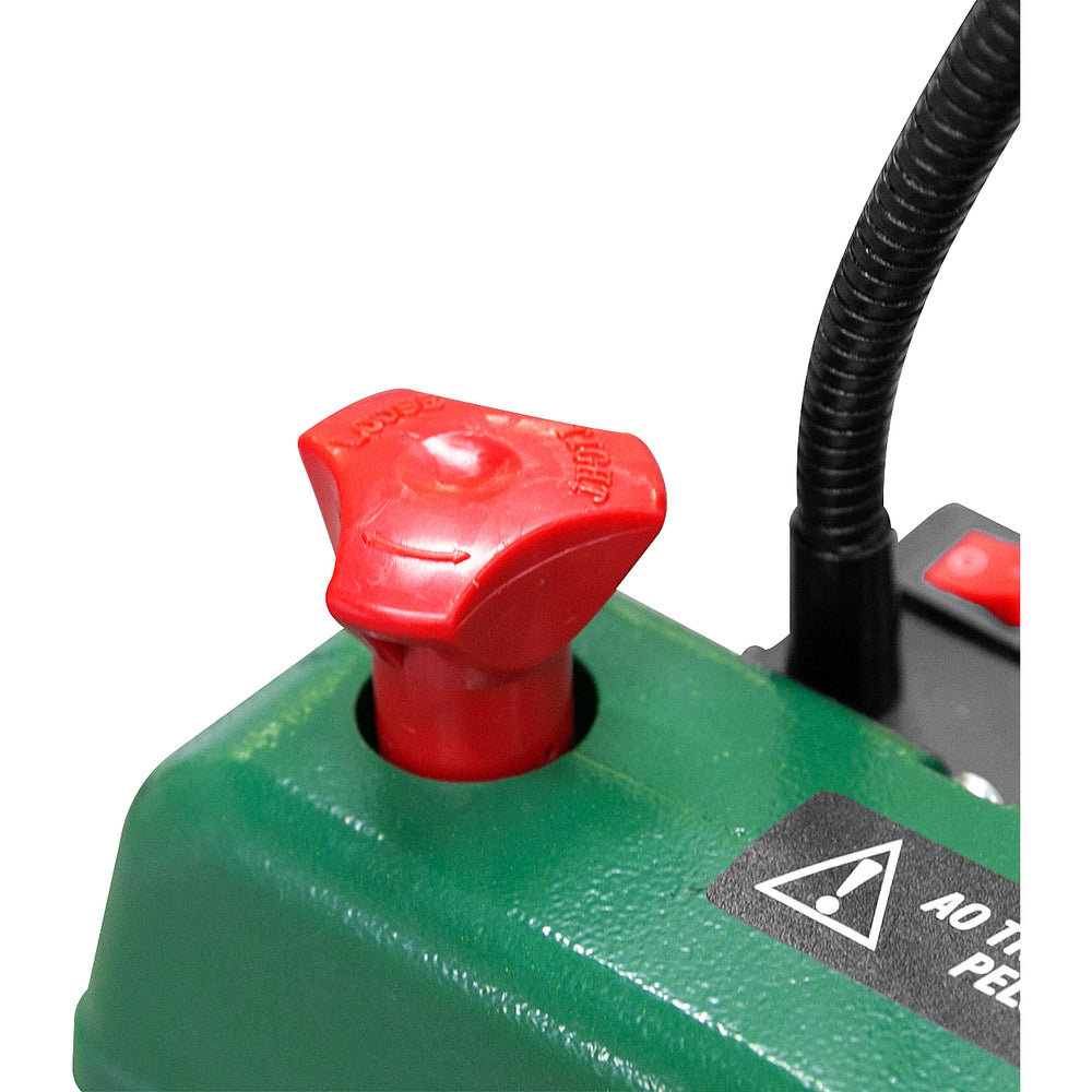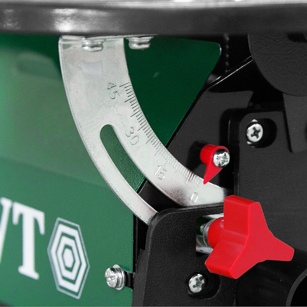 Possui base com inclinação para cortes em ângulos de até 45°, lâmpada para iluminação do local de trabalho e punho auxiliar para transporte